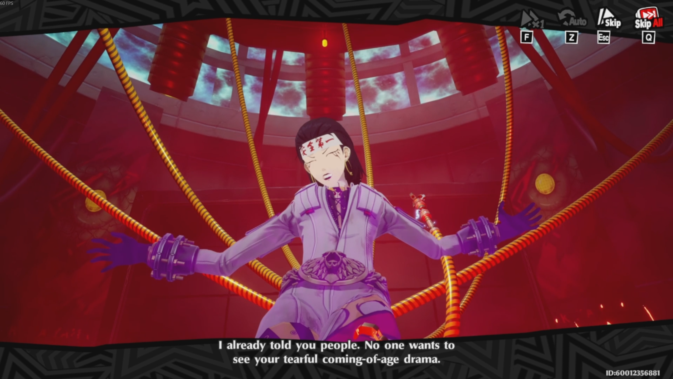 И наконец-то Фантомные воры добираются до правителя этого Palace — Тени Катаямы. Она тут же нападает на своих учеников, но как будто Тень не хочет сражаться в полную силу. Более того, в один момент Катаяма просто прерывает боссфайт, отказывается сражаться и говорит, чтобы Фантомные воры убирались отсюда. Но это никуда не годится, поэтому на сцену влетает когнитивная копия Акаси, который, такое ощущение, ломает все правила Метавёрса и насильно заставляет Тень Катаямы — своего хозяина — встать и сражаться при помощи электропроводов.