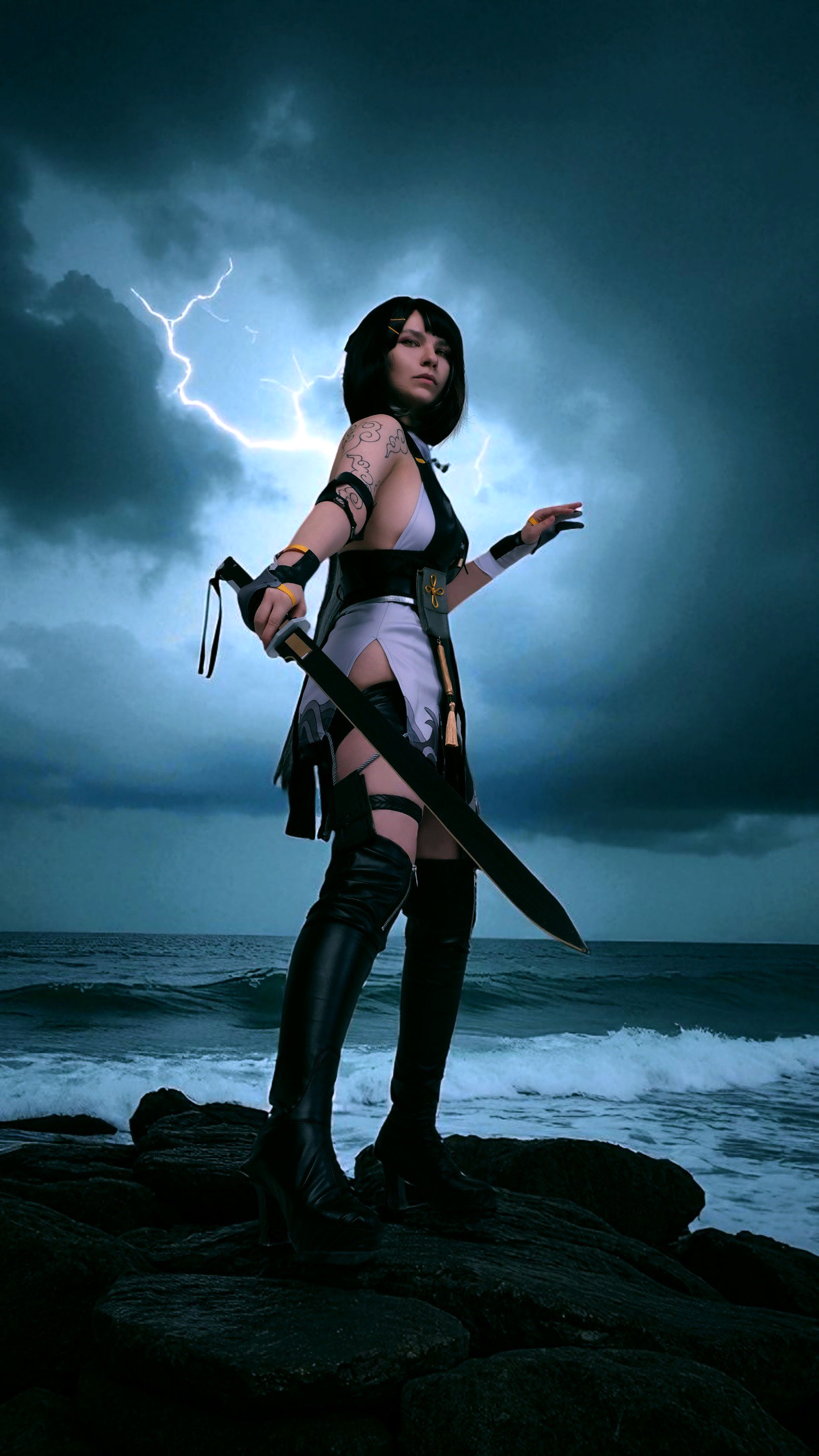 К: — Бывают ситуации, когда хочется получить канон, но также бывают ситуации, когда мне приходит в голову идея фикс и все, я это хочу. У меня бывало такое: сегодня вечером придумала, завтра утром мы поехали делать. Из недавних примеров: это был даже не то чтобы полноценный какой-то а-ля пипец продуманный косплей. Персонаж из игры «Wuthering Waves» — Хранительница берегов. И я такая: «Блин, хочу фотосет в воде». И мне пофиг, что уже конец сентября, уже холодно на пляже и вода холодная. Все ради одной фотографии.