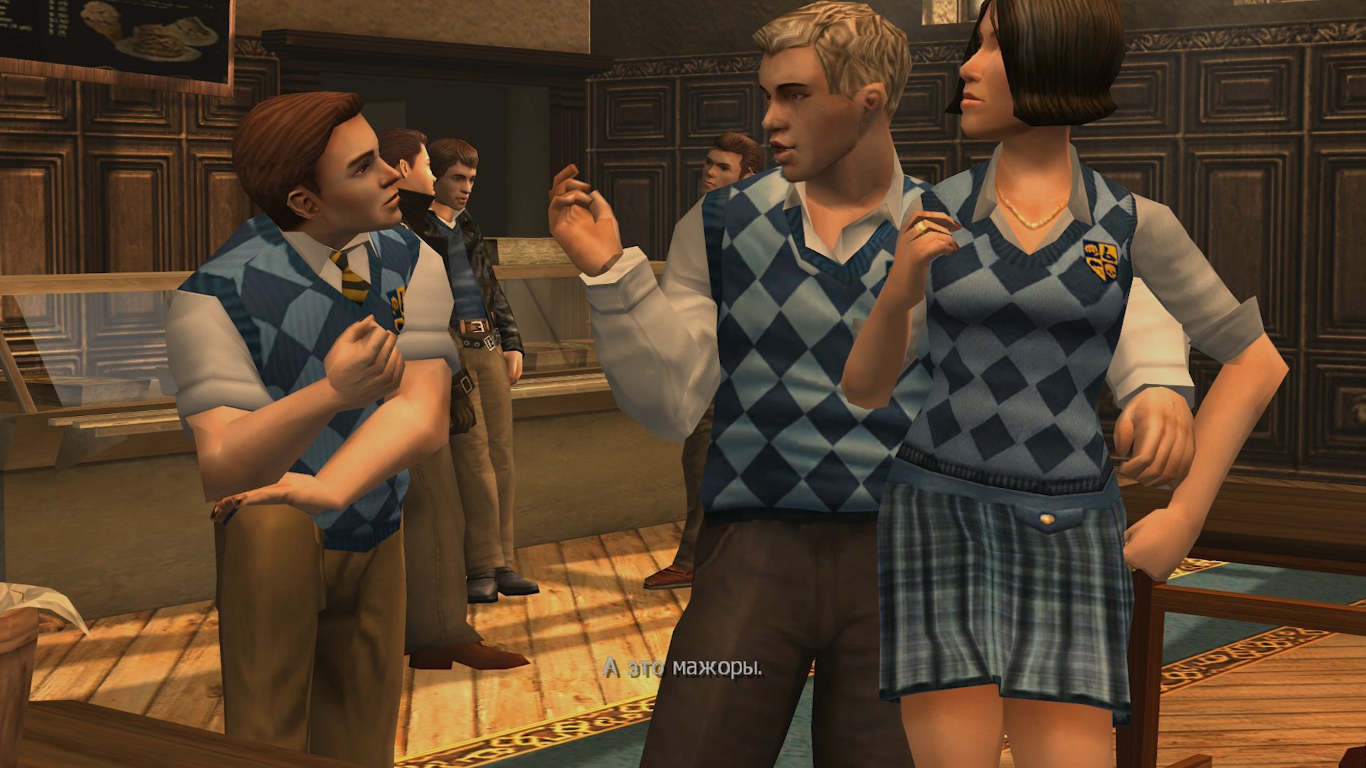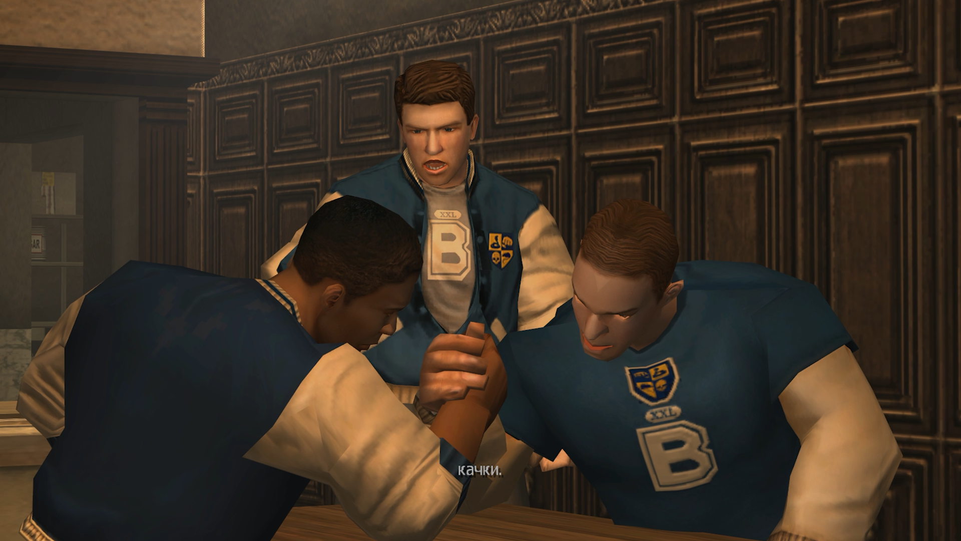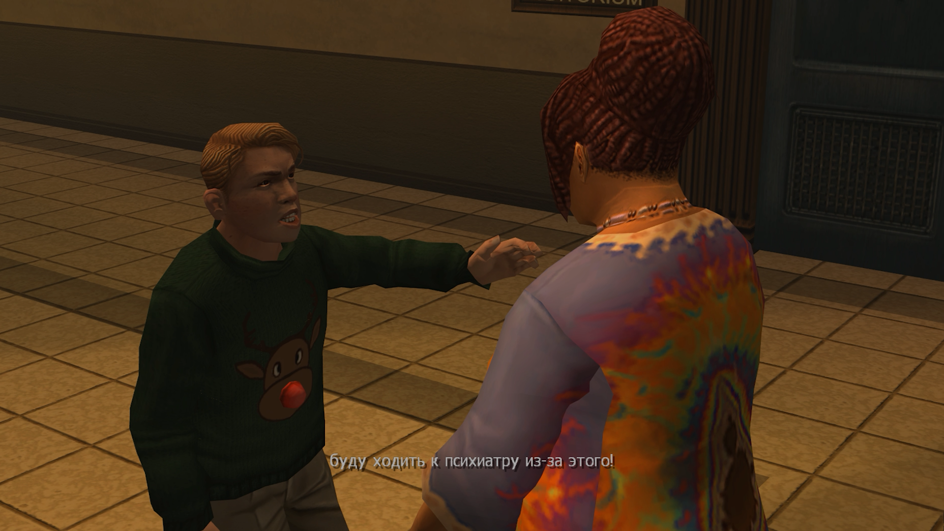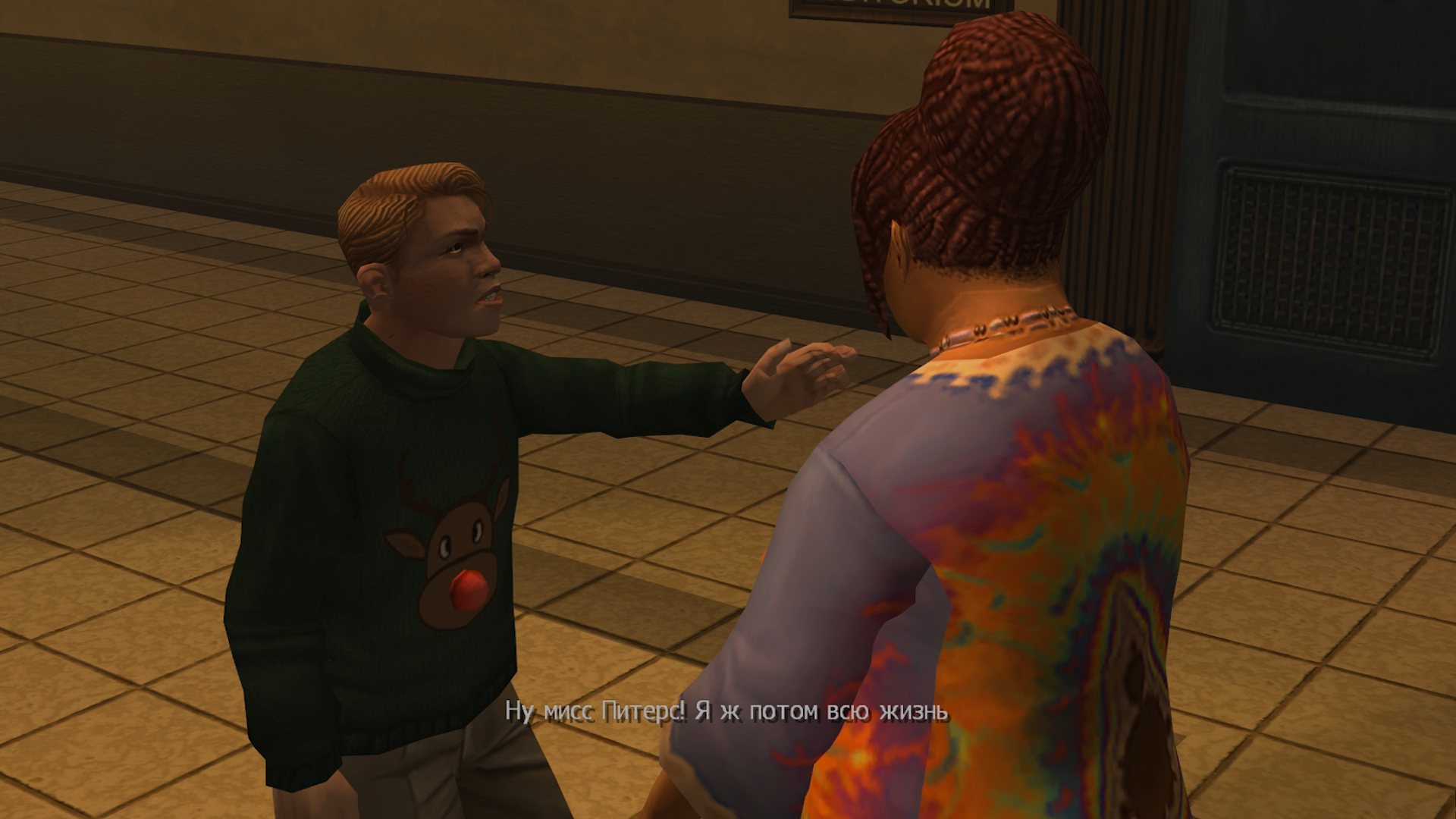 Главный лейтмотив истории обозначается в начальной сцене. Ведь как можно было бы начать Bully? Джимми могли подкараулить какие-нибудь хулиганы и прессануть. Или он мог встретить группу лузеров, познакомиться, и его обсмеют те же хулиганы. Однако нас встречает секретарь директора Дэнверс. Она не слушает Джимми, а прямо приказывает ему вести себя хорошо и пройти к директору. Попав к нему, мы видим, как командующая ранее нами Дэнверс потакает уже главе школы.