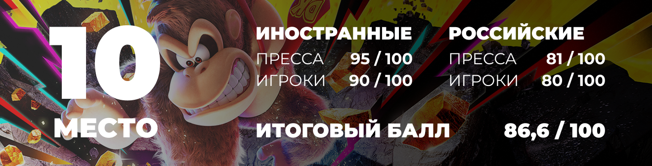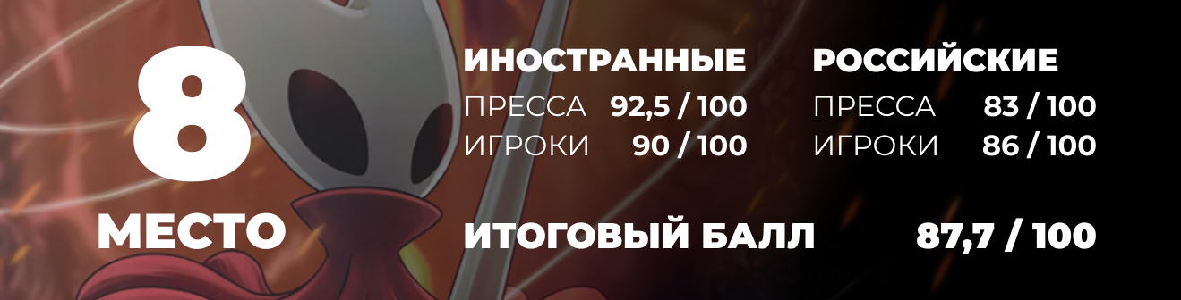 С этого момента — финишная прямая сплошь по хитам этого года. Можете писать свой личный Топ 10 игр этого года в комментариях, посмотрим совпадет ли он с итоговым по баллам. Например, на восьмом месте сходит с дистанции одна из самых ожидаемых игр последних пяти лет — Hollow Knight: Silksong