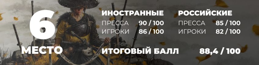 В шаге от пятерки лучших остановился громкий релиз, который лично я вообще не заметил. Не знаю как так произошло, возможно ее выход был заглушен другими оглушительными релизами осени. На шестом месте расположилась Ghost of Yōtei, и я не согласен с таким высоким размещением в топе.