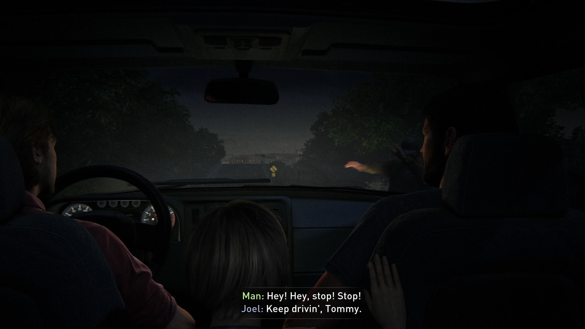 Милая сцена прерывается внезапно наступившей апокалиптичной реальностью. Начавшаяся эпидемия еще неизвестного вируса (а точнее грибка) кордицепса вынуждает Джоэла и Сару бежать из их дома вместе с братом главного героя, Томми. Уже в этом небольшом отрывке, состоящем из поездки трех персонажей, происходит событие, которое позволяет игроку вынести первое и вместе с тем всеобъемлющее суждение о разнице характеров двух братьев — наше трио замечает идущую по обочине семейную пару с ребенком. Томми намеревался остановиться и подобрать бедолаг, ведь их машина могла вместить еще несколько людей, тогда как Джоэл без тени сомнения почти что приказывает младшему брату продолжать ехать вперед.