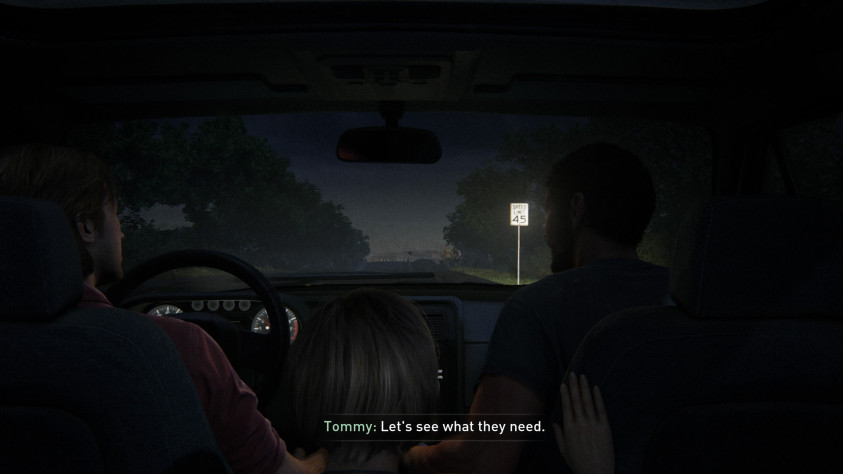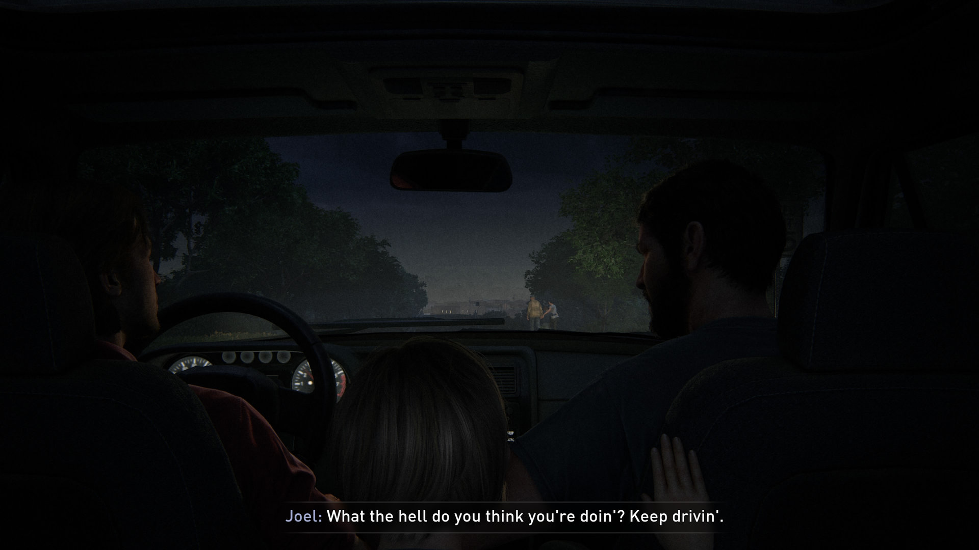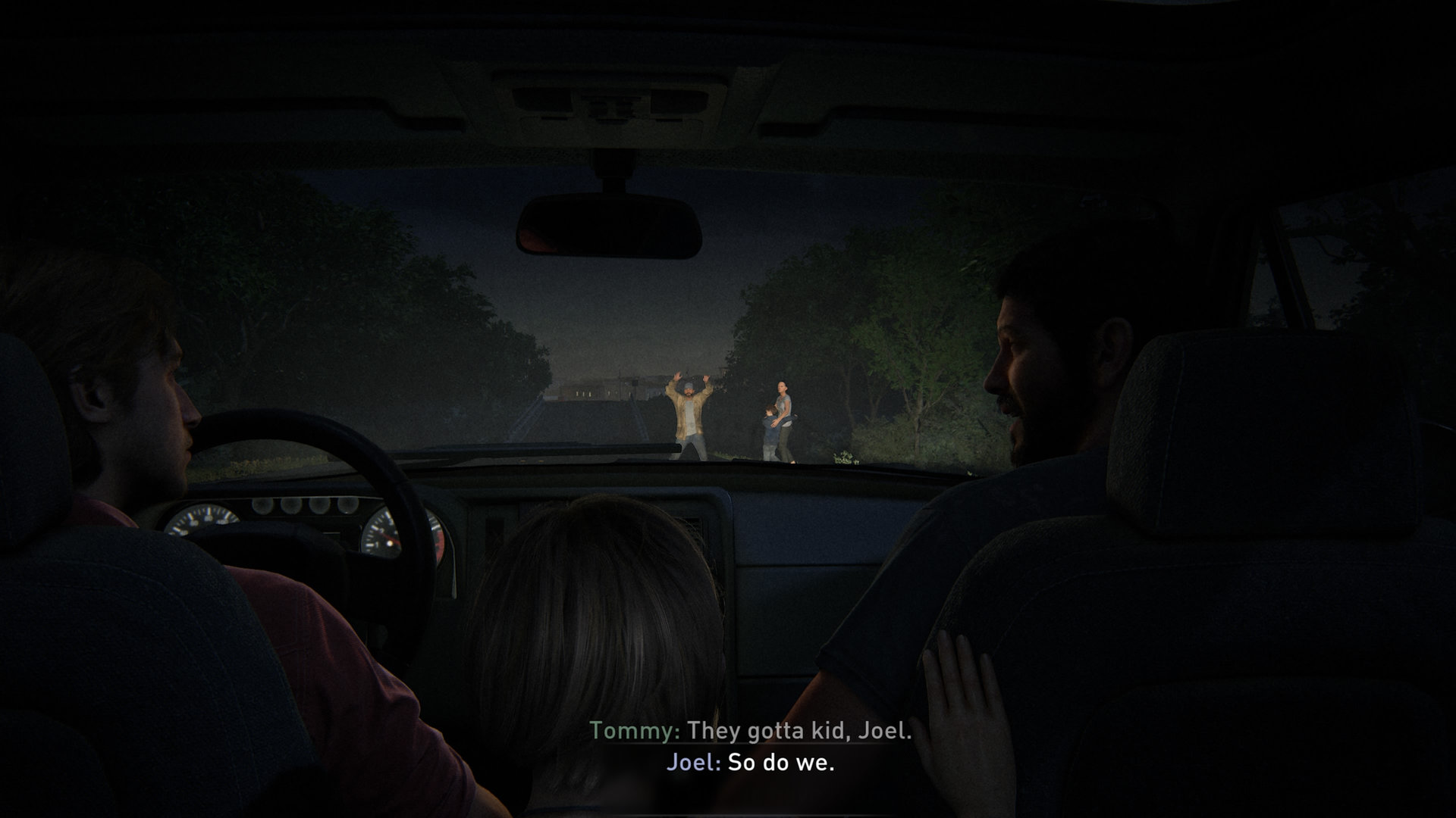 Также эта сцена служит отличной репрезентацией иерархии внутри дуэта Джоэла и Томми — хоть именно младший брат сидит за рулем, т. е. в его силах остановиться и подобрать нуждающуюся семью вопреки словам старшего брата, но он не смеет ослушаться указания Джоэла, хоть он с ним, скорее всего, в корне не согласен.