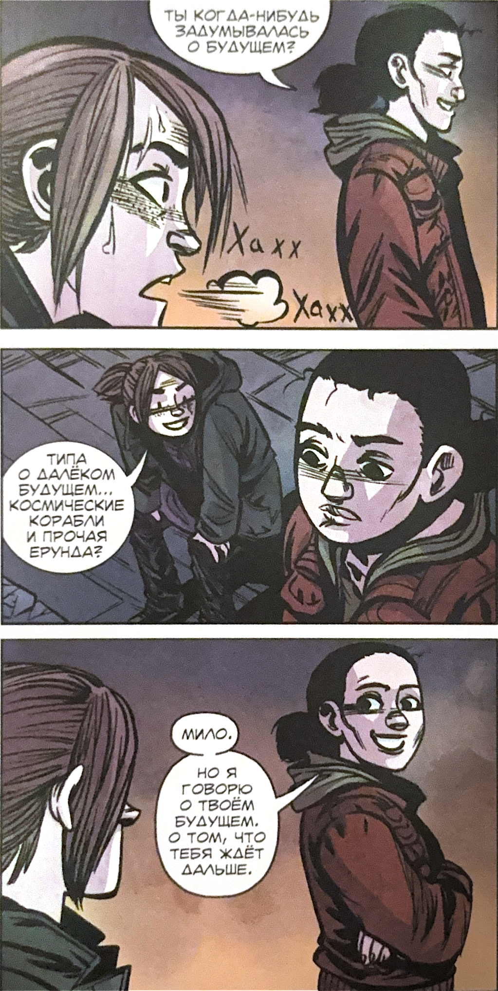 Так заканчивается комикс «Американские мечты». Признаться честно, данный материал служит по большей части фансервисом для тех, кому полюбилась игра. Однако стоит отдать комиксу должное — он обрисовывает характер Элли, выделяя в нем главные черты, которые постоянно будут давать о себе знать в дальнейшей истории. Что немаловажно, «Американские мечты» закладывают фундамент… дружбы Элли и Райли, а также заставляют главную героиню задаться вопросом — кем она себя видит в этой жизни?