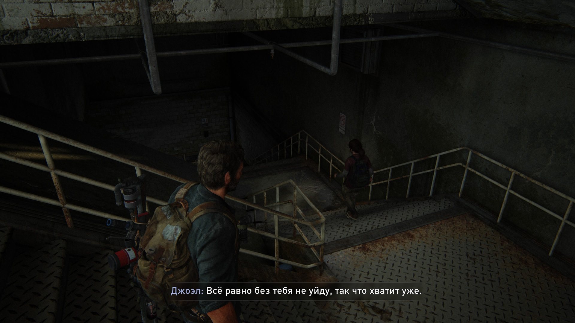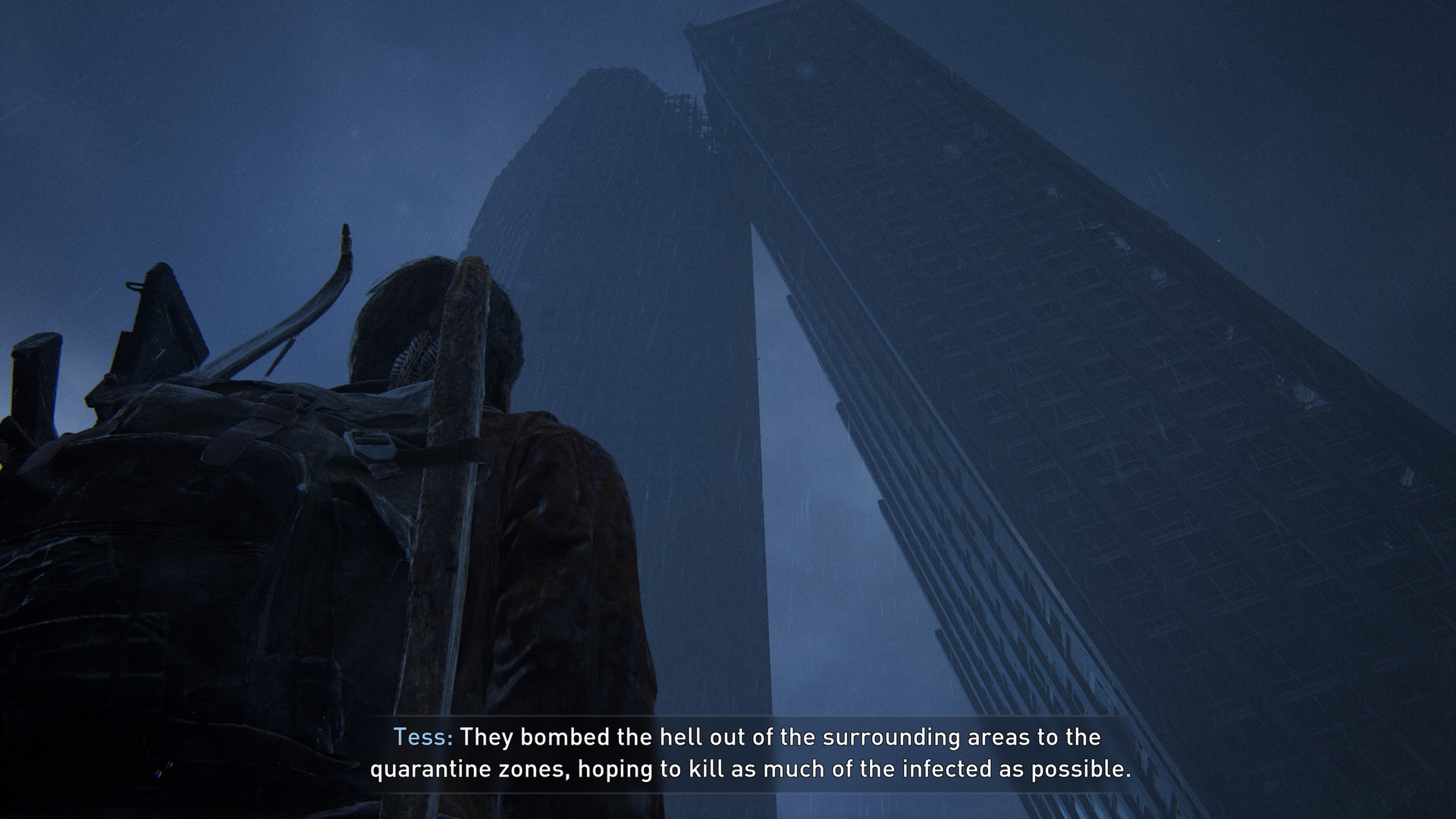 Поддавшись на уговоры Тесс, герои продолжают следовать к финальной точке маршрута — Капитолию, где их должна встретить группа Цикад. Они пробираются чрез один из уже упомянутых мной разрушенных небоскребов. К слову, здесь Тесс зарекается о её с Джоэлом будущем — девушка планирует залечь на дно после доставки Элли. Это удивляет главного героя, ведь он, как крайне консервативный человек, сам твердил напарнице про это, но она его не слушала.