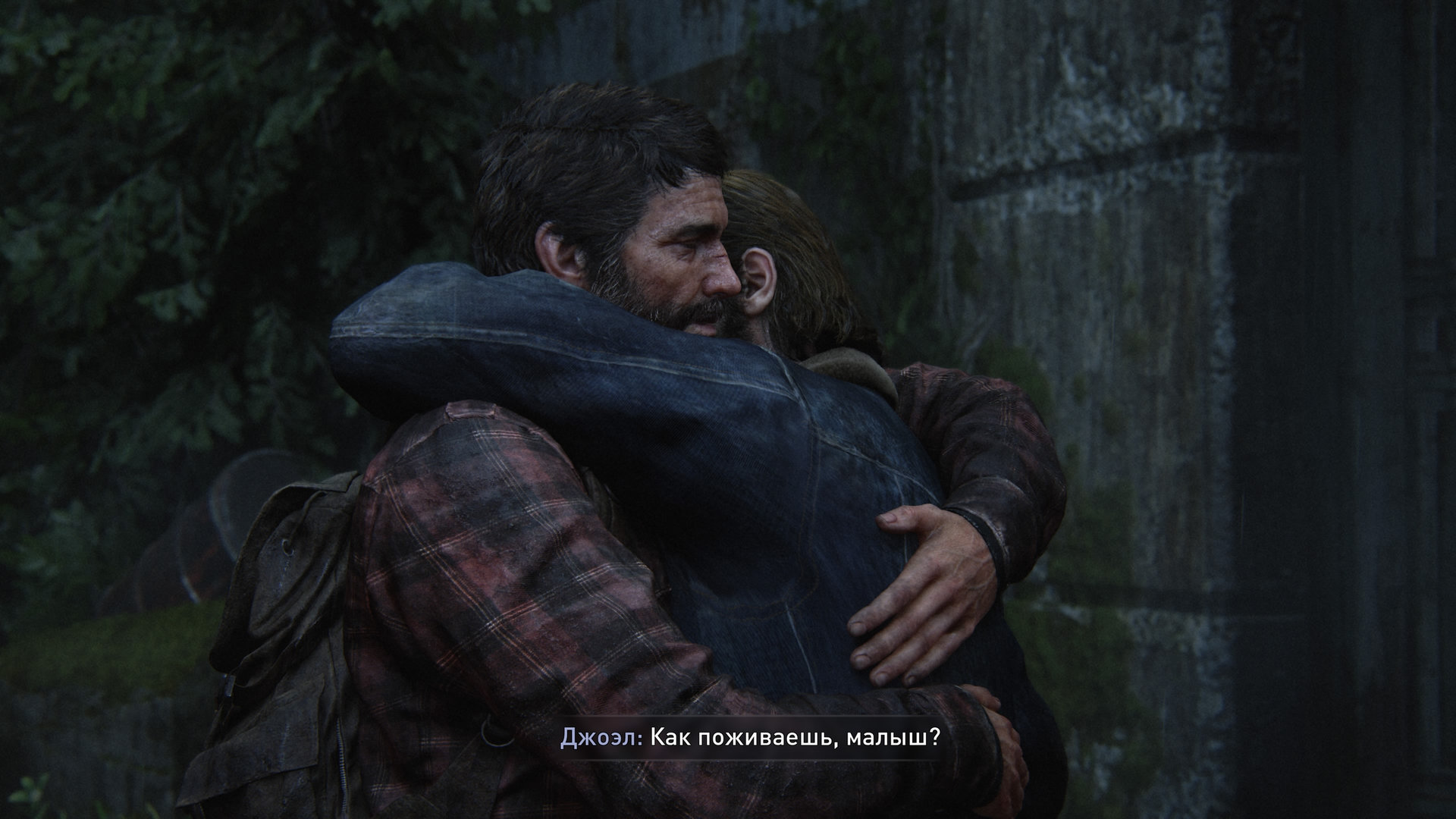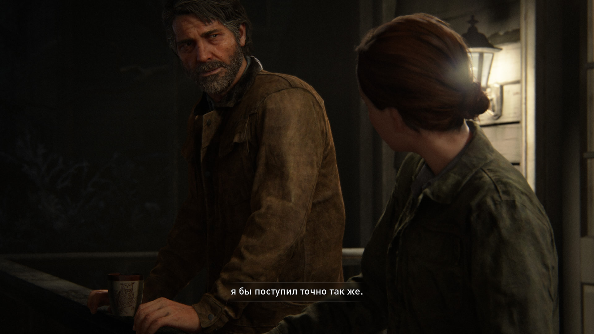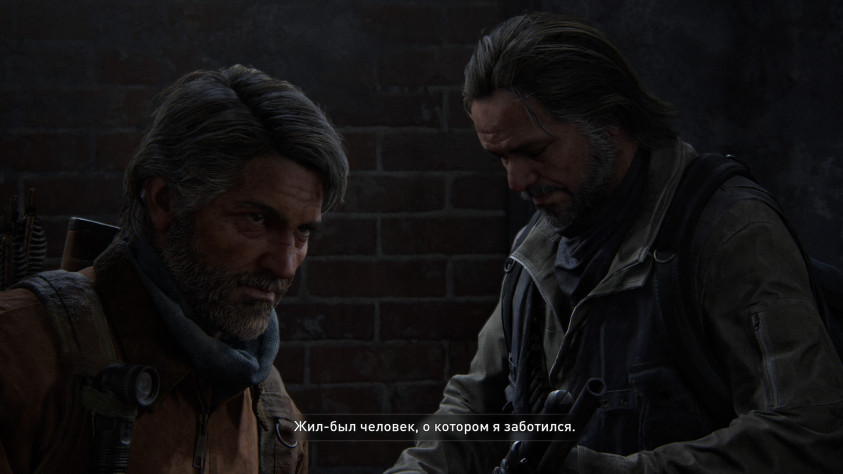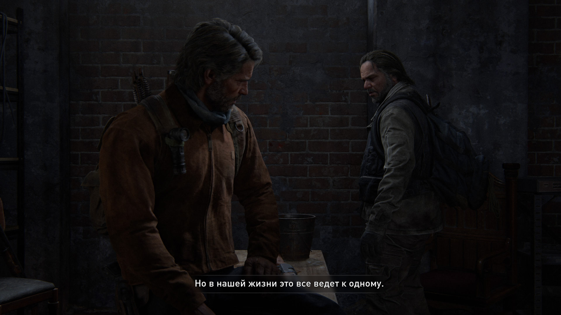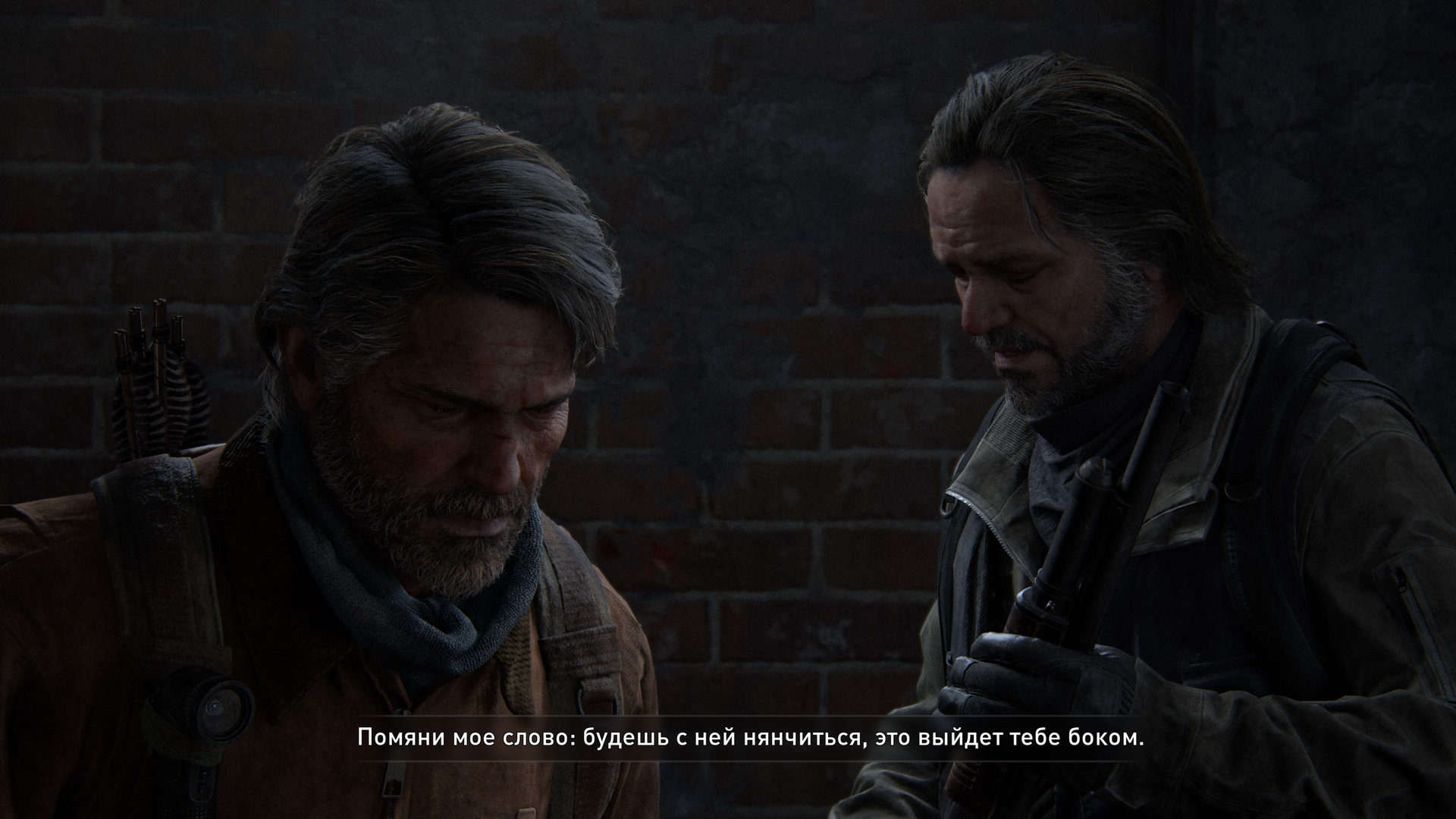 Возможно, читателю покажется странным, с какой дотошностью я разбираю фрагмент длиной в 5 секунд, происходящий даже не в рамках кат-сцены. Однако, пожалуй, каждый, кто знаком с сюжетом первой и второй частей TLoU, при повторном детальном рассмотрении этой сцены могут поразиться, с какой полнотой этот небольшой отрезок отражает суть характеров Джоэла и Томми.