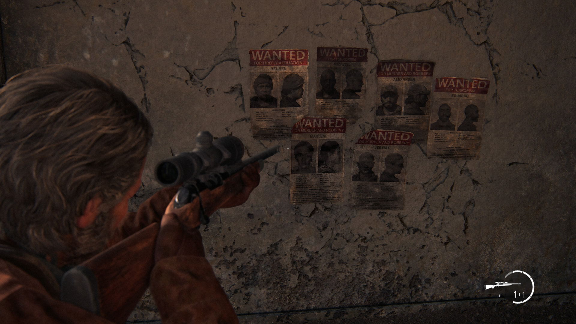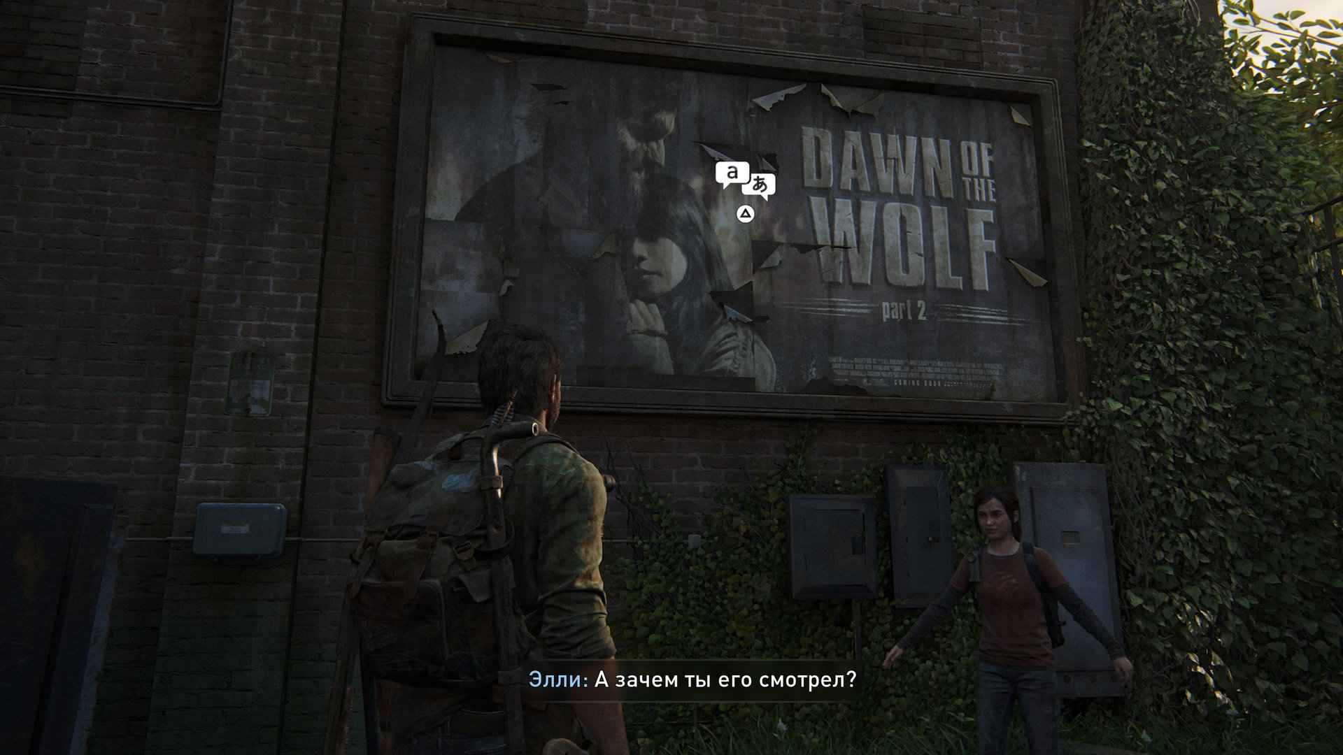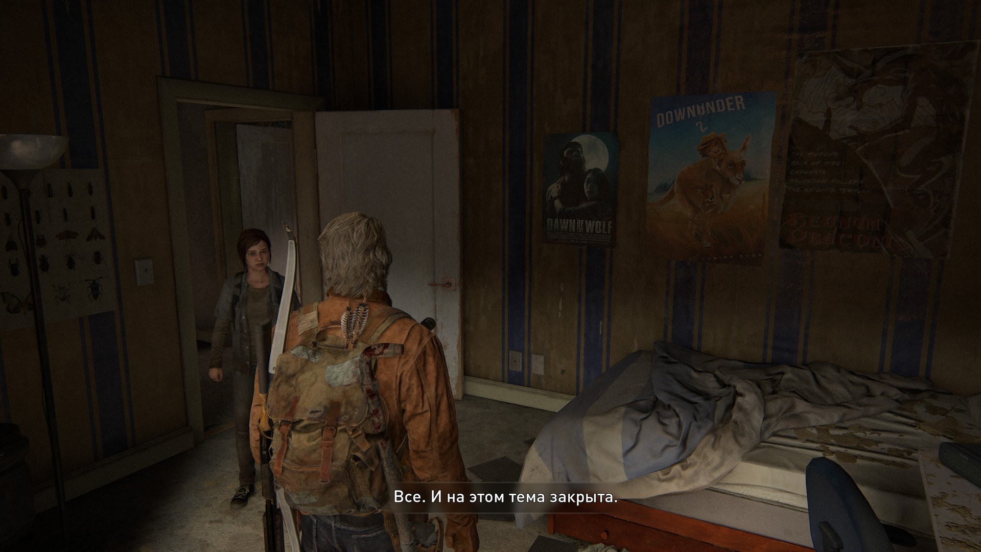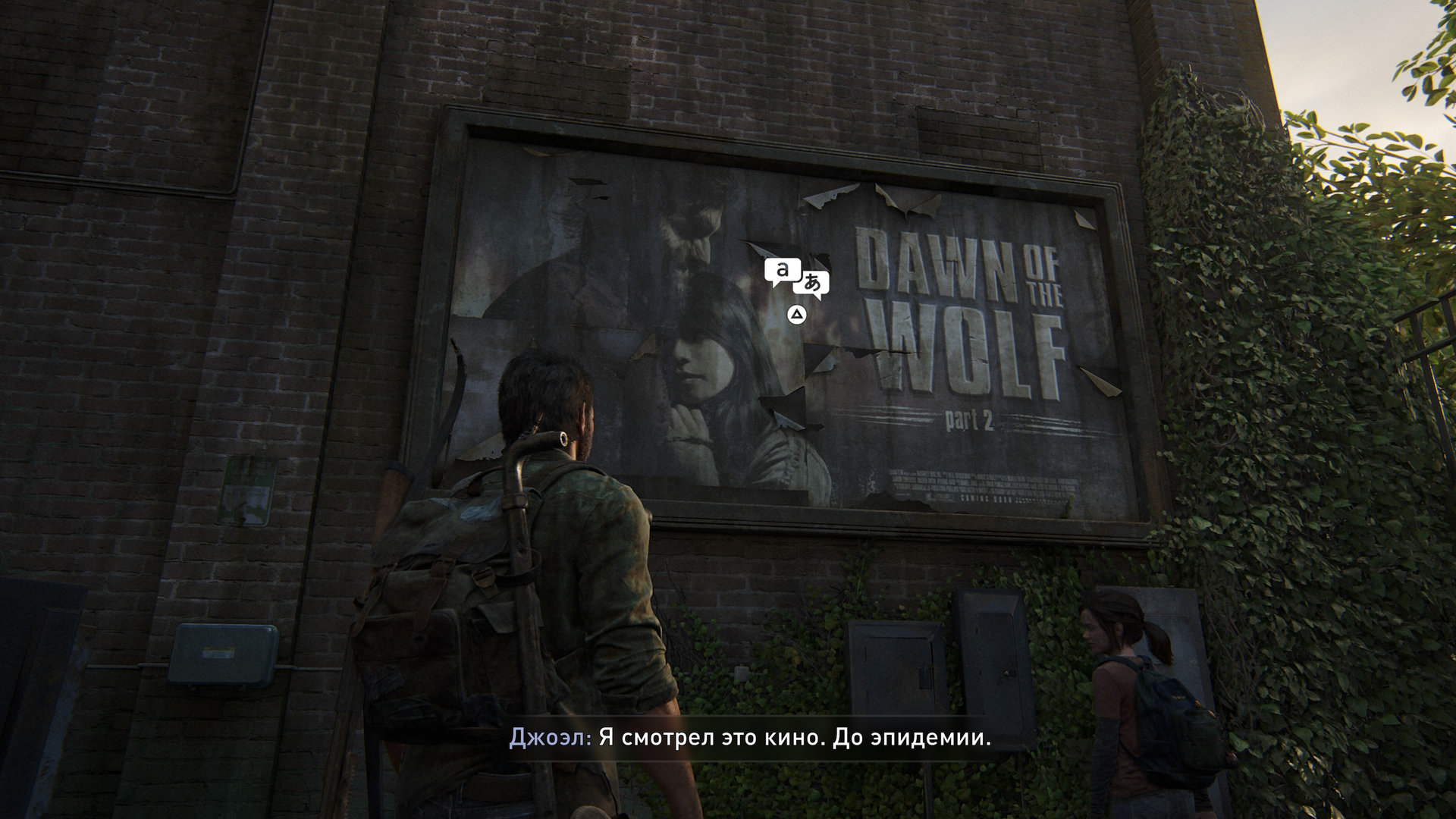 Вообще при неоднократном перепрохождении обеих игр серии внимательный игрок начнет подмечать обильное использования предзнаменований, или foreshadowing на английском. Это проявляется как в репликах героев (я еще успею осветить этот аспект), так и в неоднократном повторении визуальных образов, тянущихся из прошлого персонажей, память о котором они тщетно пытаются в себе заглушить, в грядущее. Одним из таких символов является постер фильма «Dawn of the Wolf», который можно найти в комнате Сары. Позже эта деталь, недоступная игроку при первом прохождении, станет маркером развития отношений между Джоэлом и Элли.