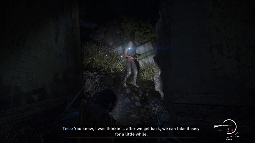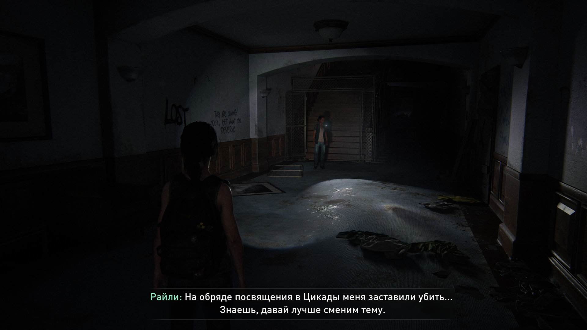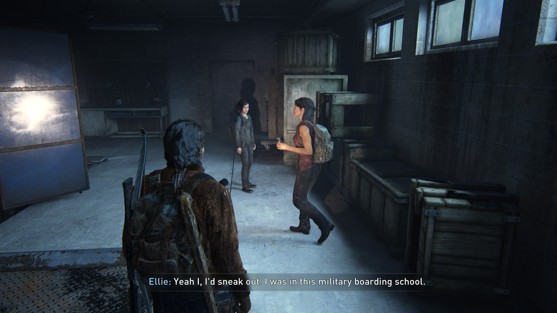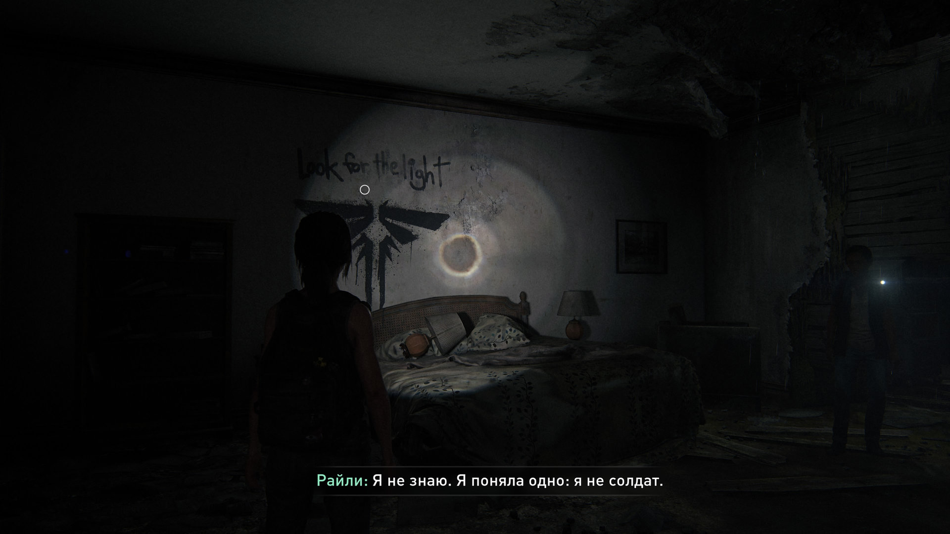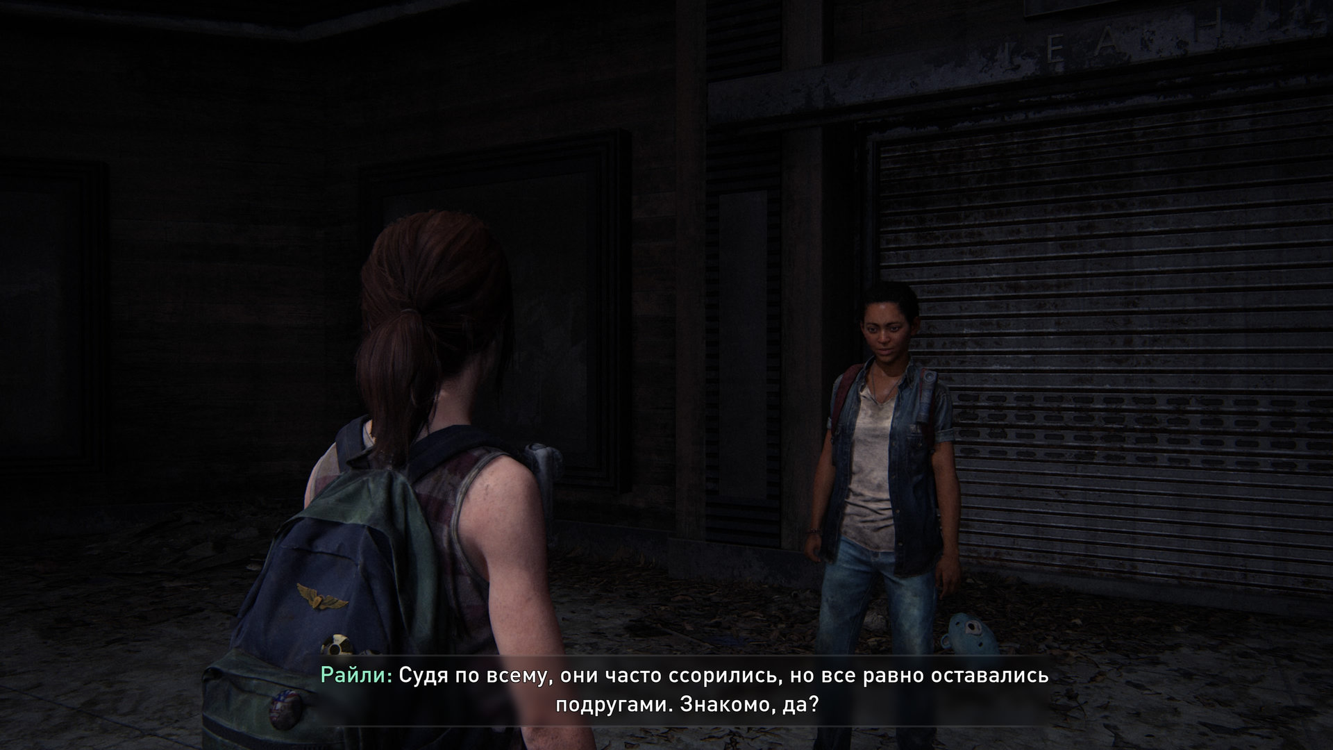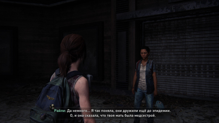 За этот сюжетный отрывок Элли успеет поведать Джоэлу и Тесс чуть больше про детали своего укуса на руке, однако, что наиболее примечательно, она не спешит раскрыть всю историю своего «заражения». Ее с Райли дружба — нечто очень личное, персональное, о чем героиня упорно умалчивала почти что всю первую часть.