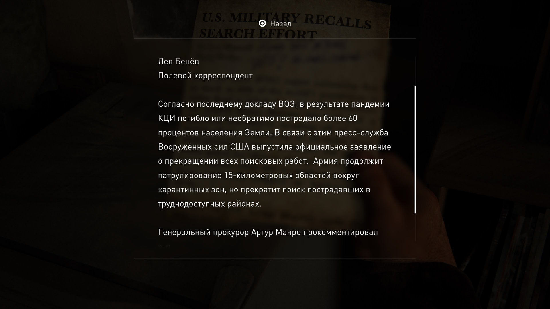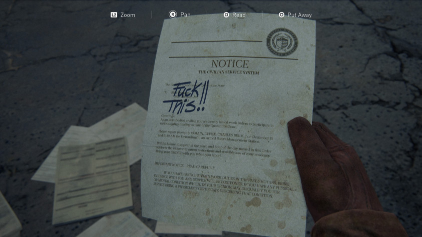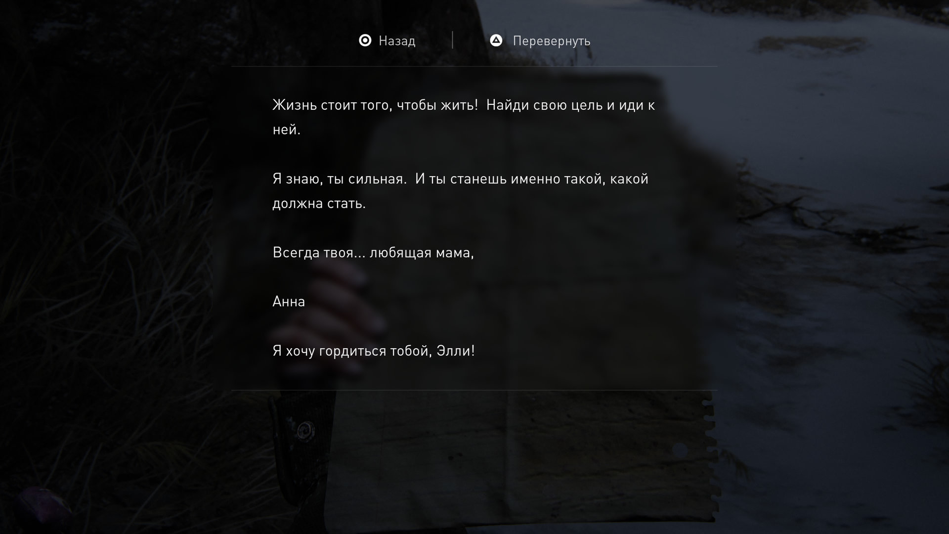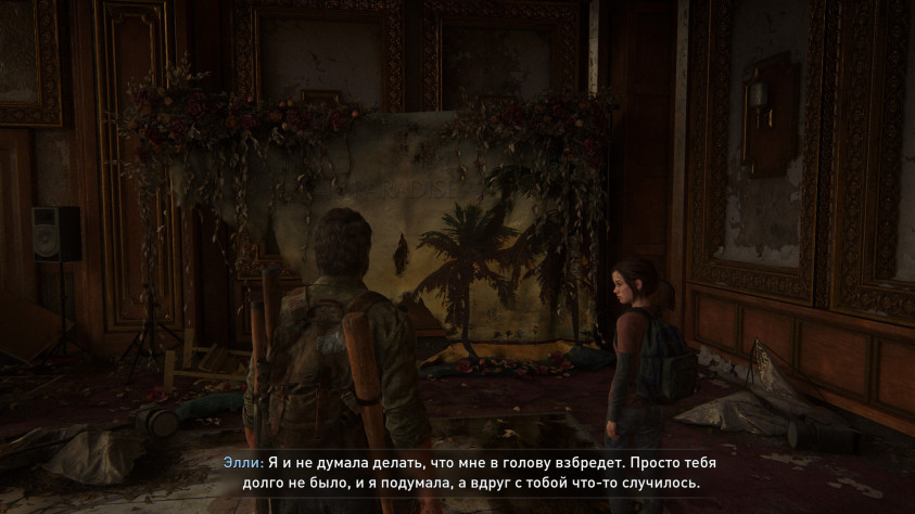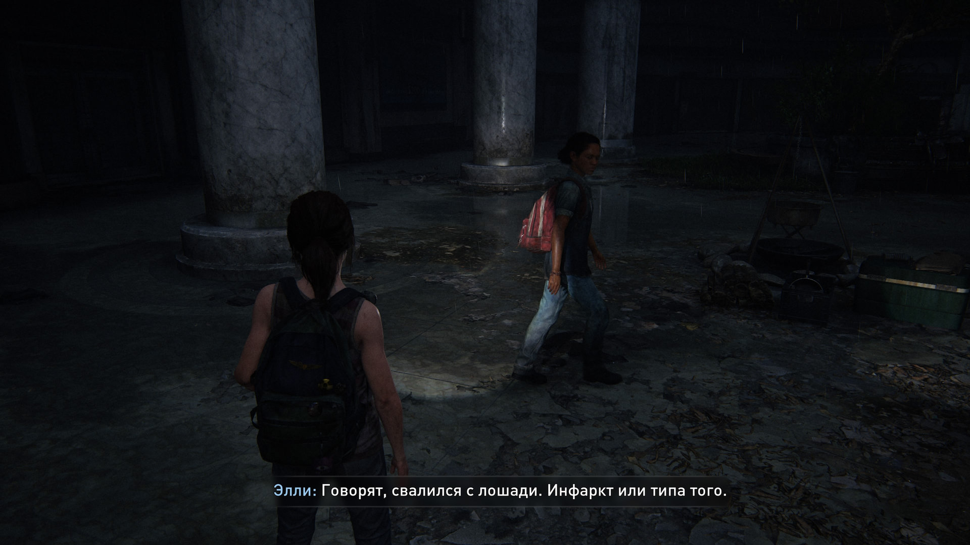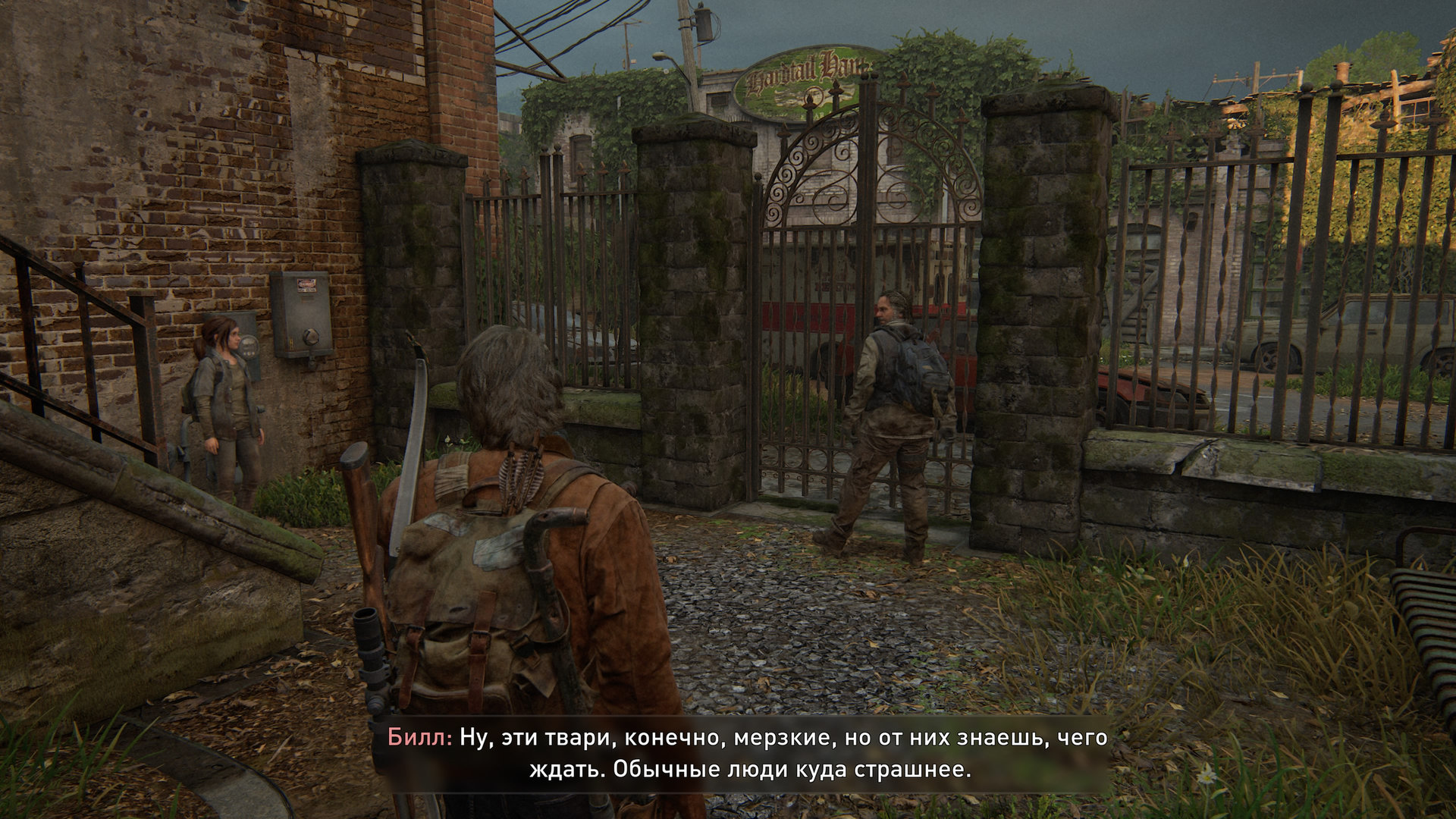 За этот сюжетный отрывок Элли успеет поведать Джоэлу и Тесс чуть больше про детали своего укуса на руке, однако, что наиболее примечательно, она не спешит раскрыть всю историю своего «заражения». Ее с Райли дружба — нечто очень личное, персональное, о чем героиня упорно умалчивала почти что всю первую часть.