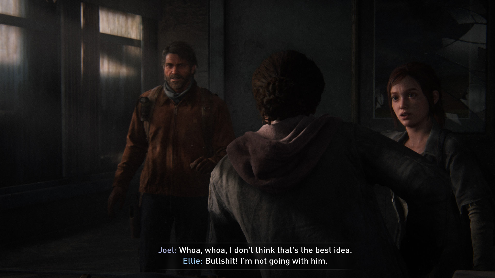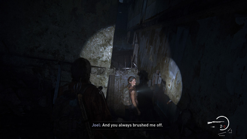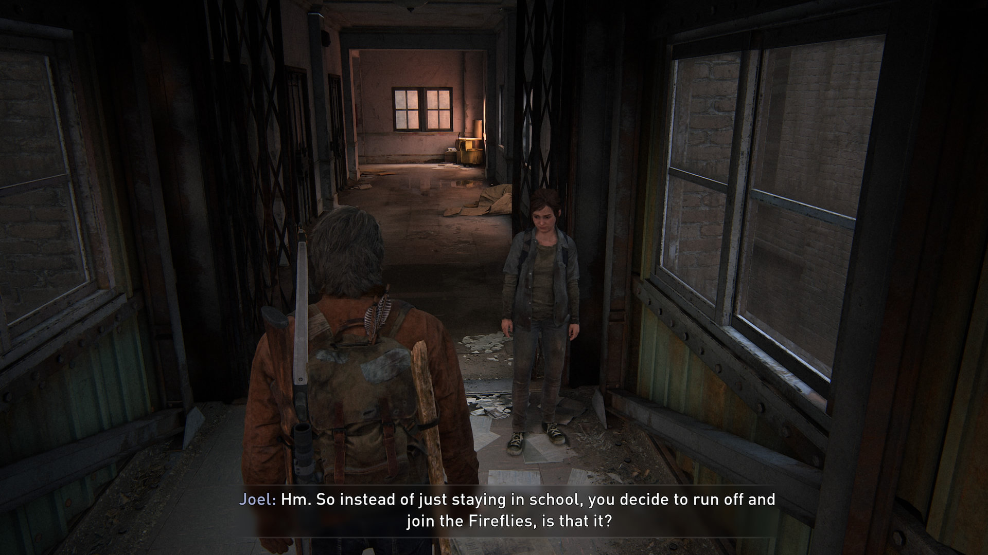 Непродолжительная прогулка с Элли ощущается сценой с изрядно затянувшимся неловким молчанием — Джоэл не проявляет никакого энтузиазма, общаясь со своей юной спутницей, пытаясь относиться к ней буквально как к грузу. Лишь ближе к концу геймплейного сегмента главный герой попытается вызнать у Элли причину, по которой она так важна для Марлин. Однако этот диалог едва ли можно назвать комплиментарным.