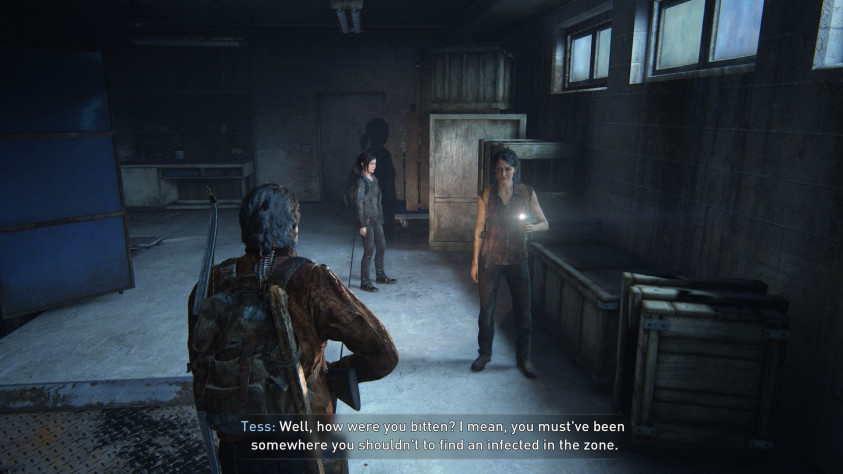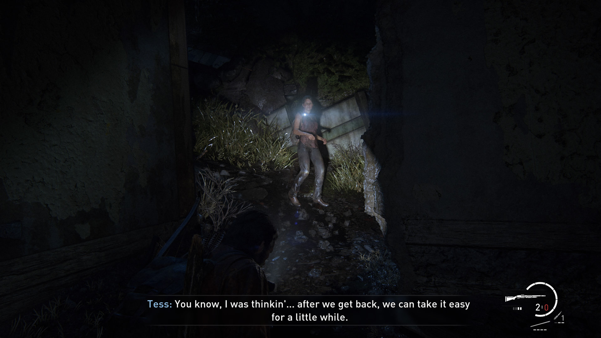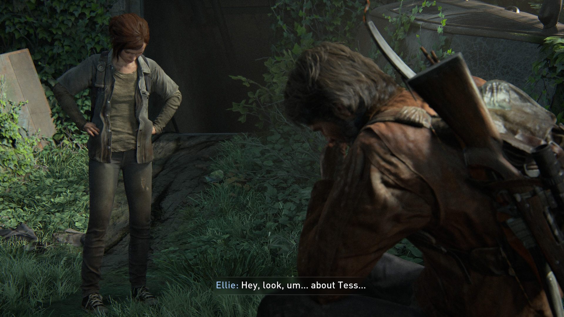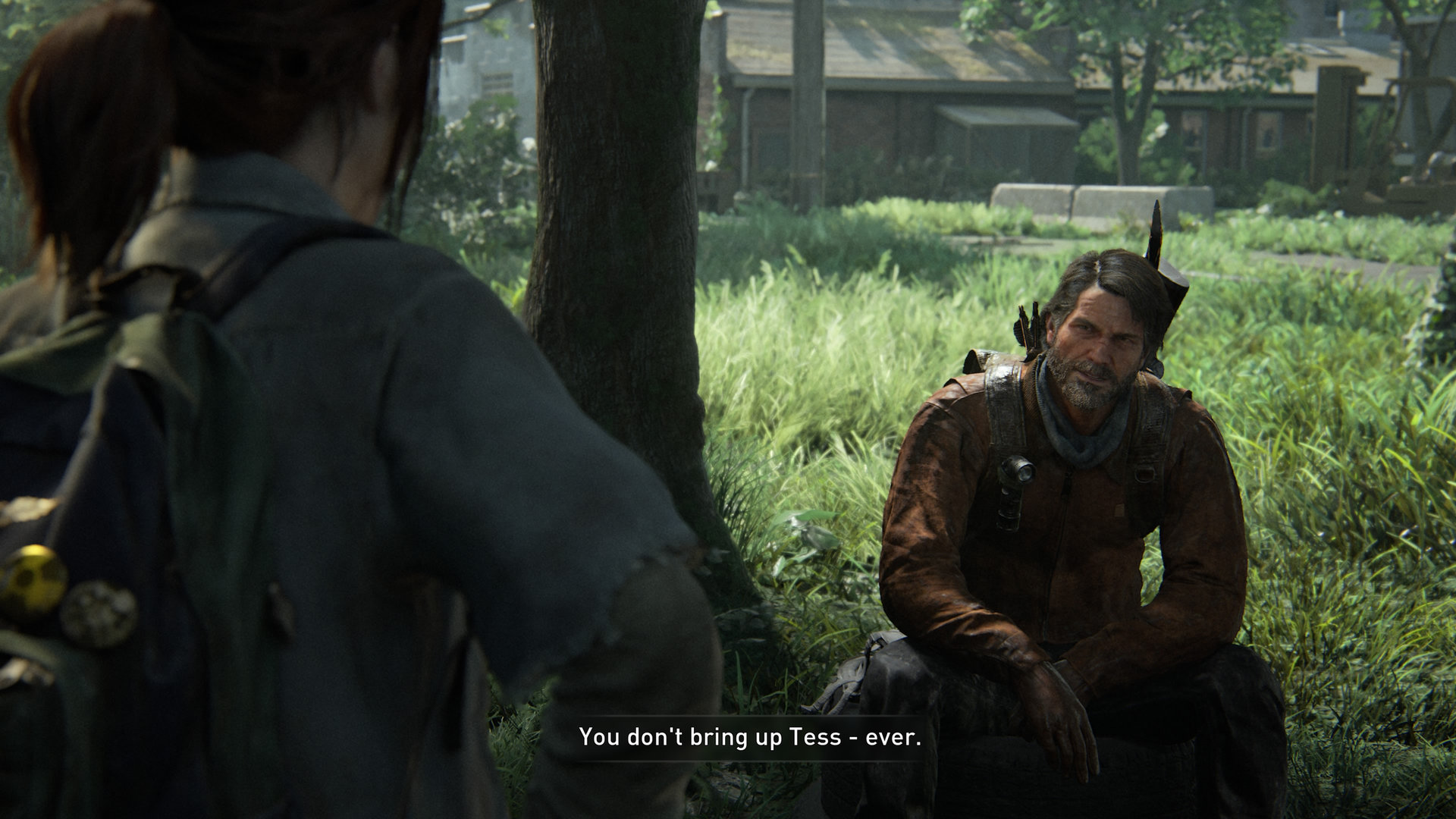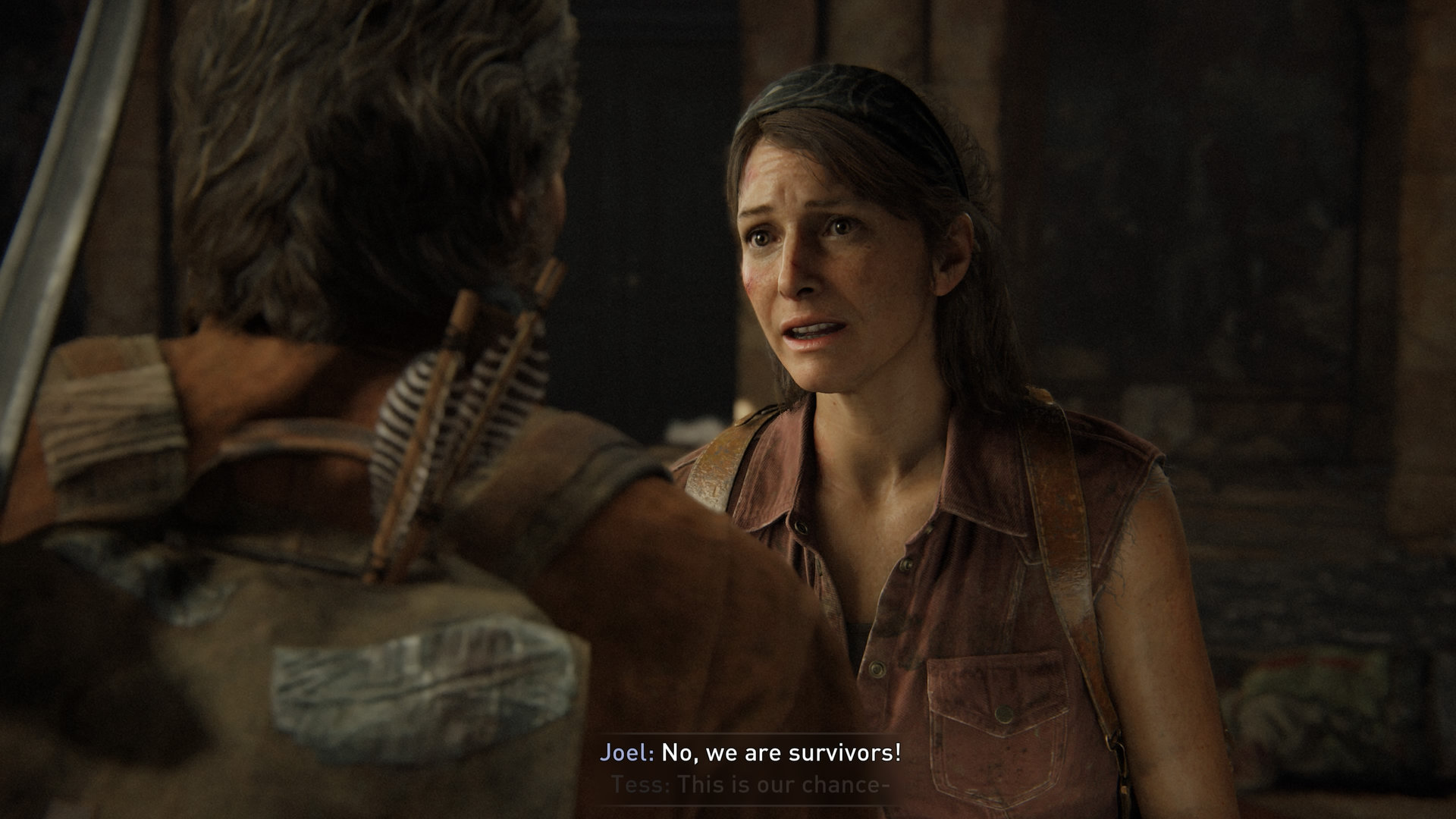 Самое важное здесь — главный герой не верит во все сказанное, тогда как напарница все-таки пытается склонить его завершить эту работу. В качестве главного аргумента Тесс: «мы уже зашли далеко, давай просто закончим это». И с напарницей Джоэла трудно не согласится, ведь останавливаться на полпути бессмысленно. Так, устами персонажа Тесс сценаристы задают ключевую максиму дилогии The Last of Us, которой пока что следует только она, однако в дальнейшем этим кредо будет руководствоваться уже другой персонаж.