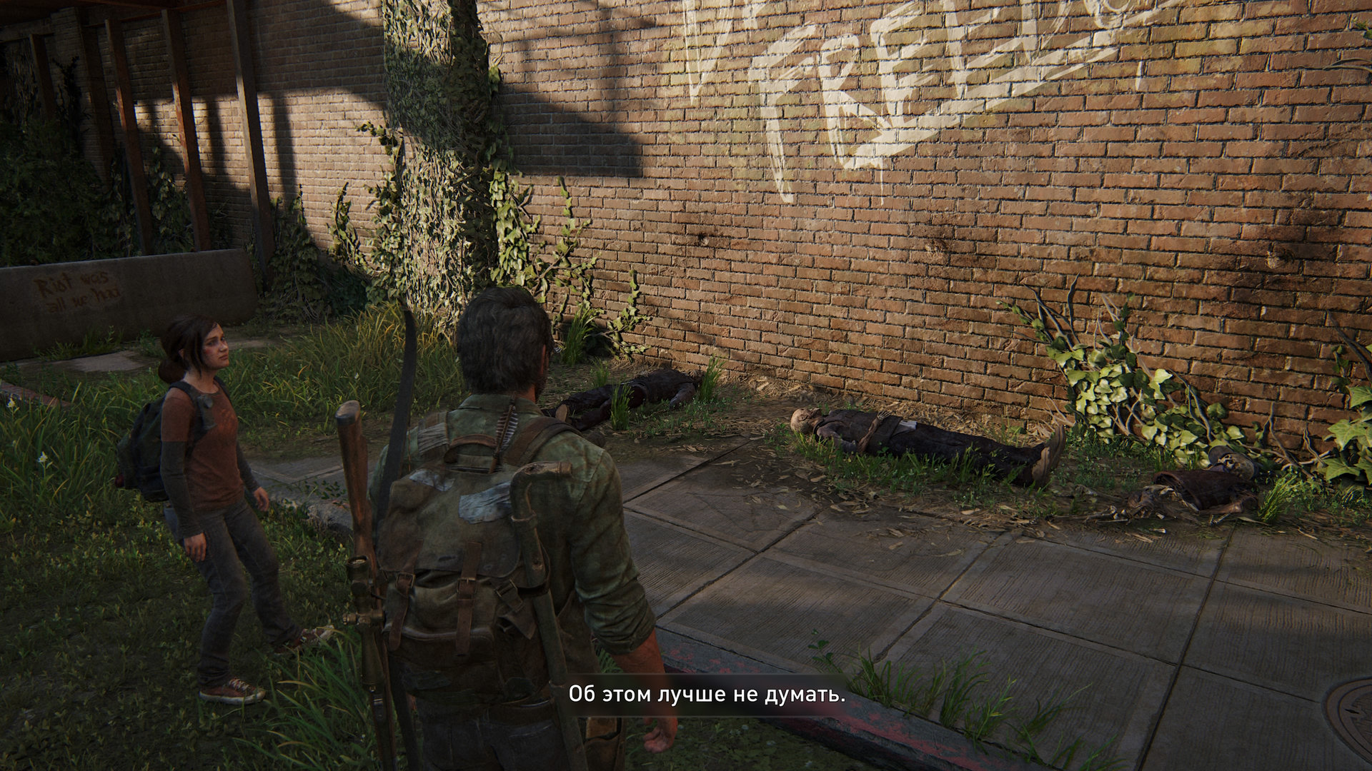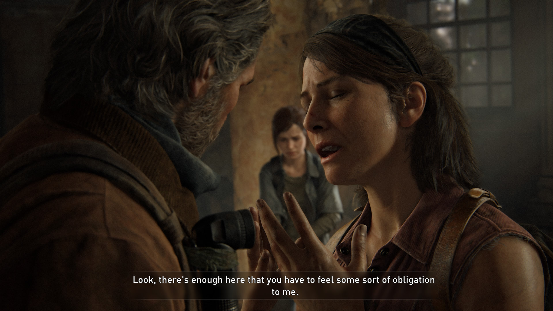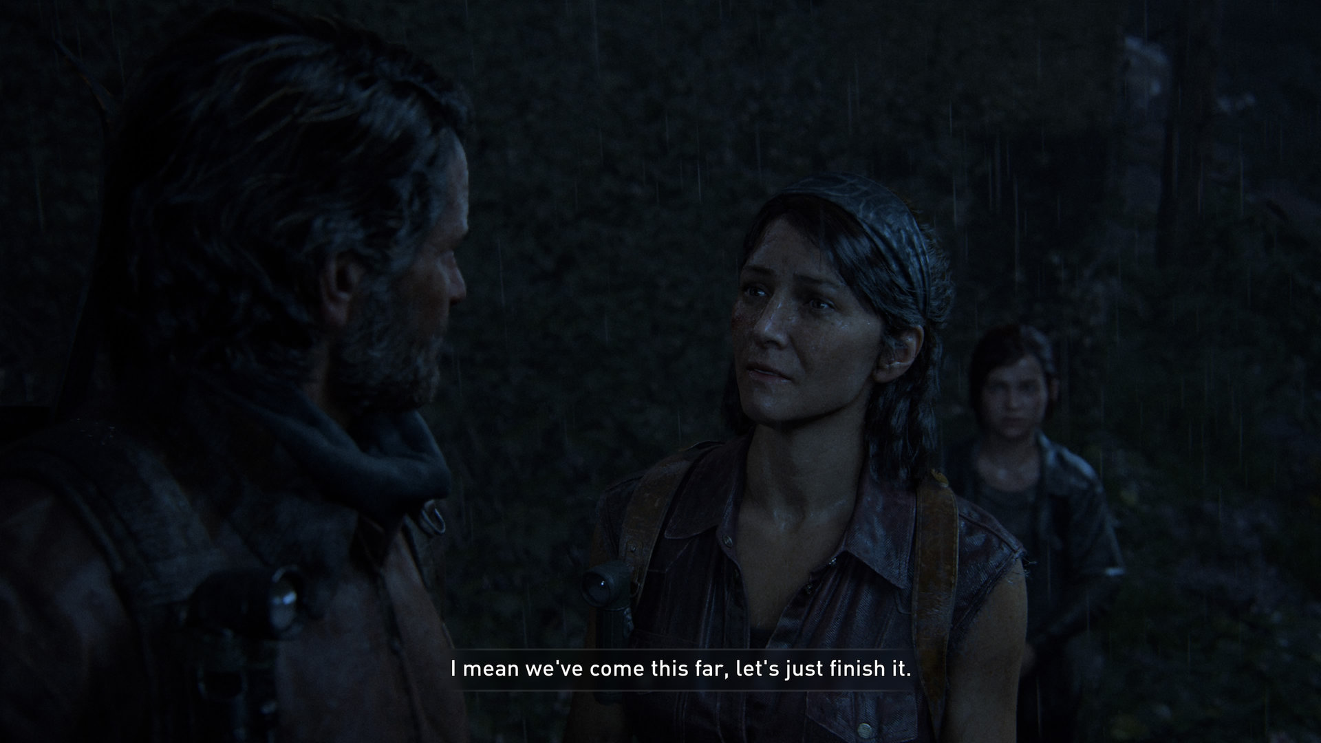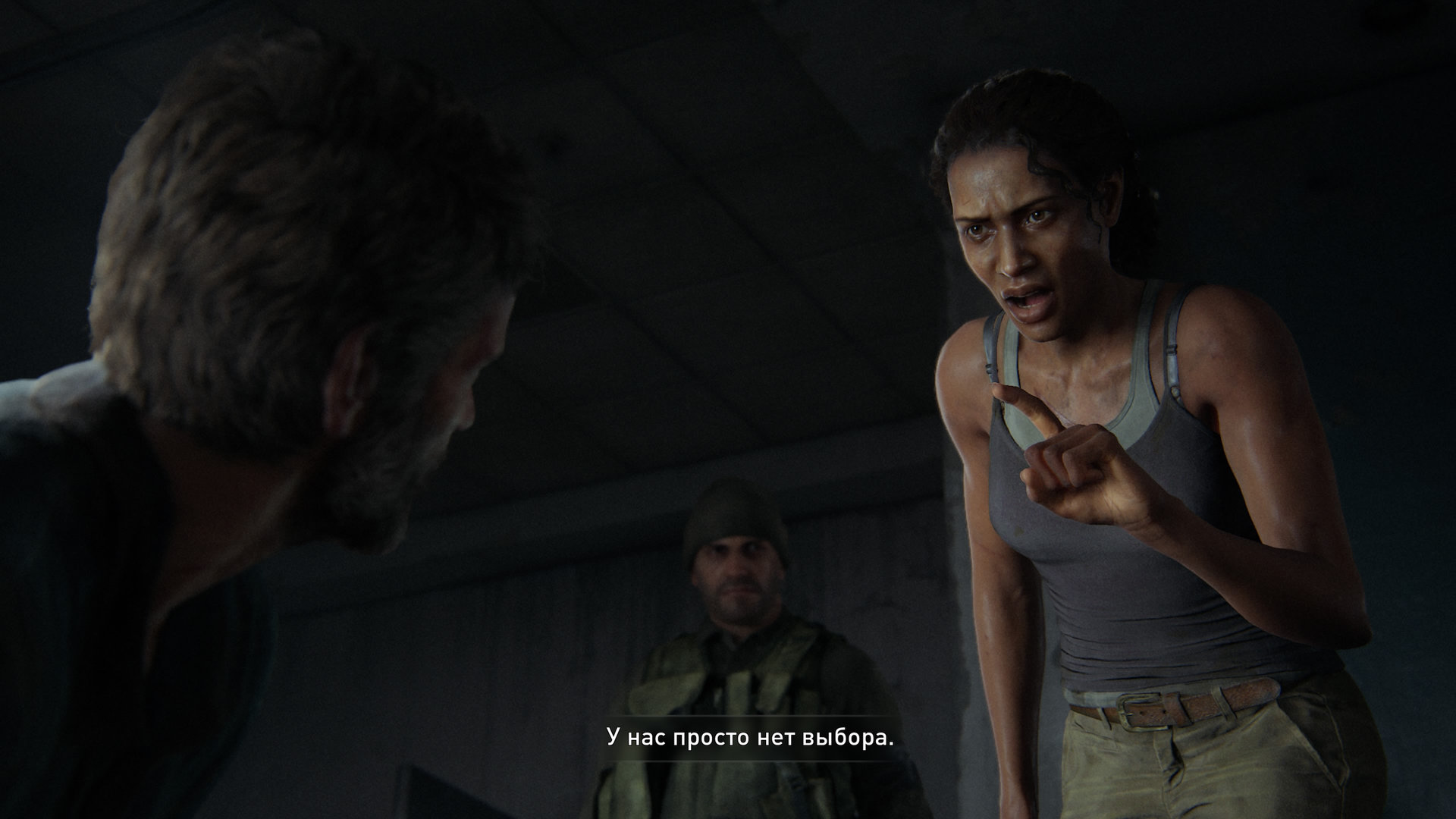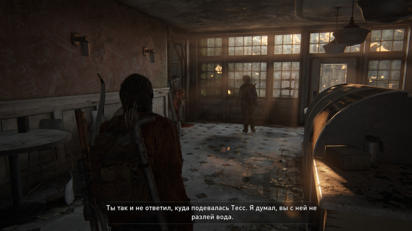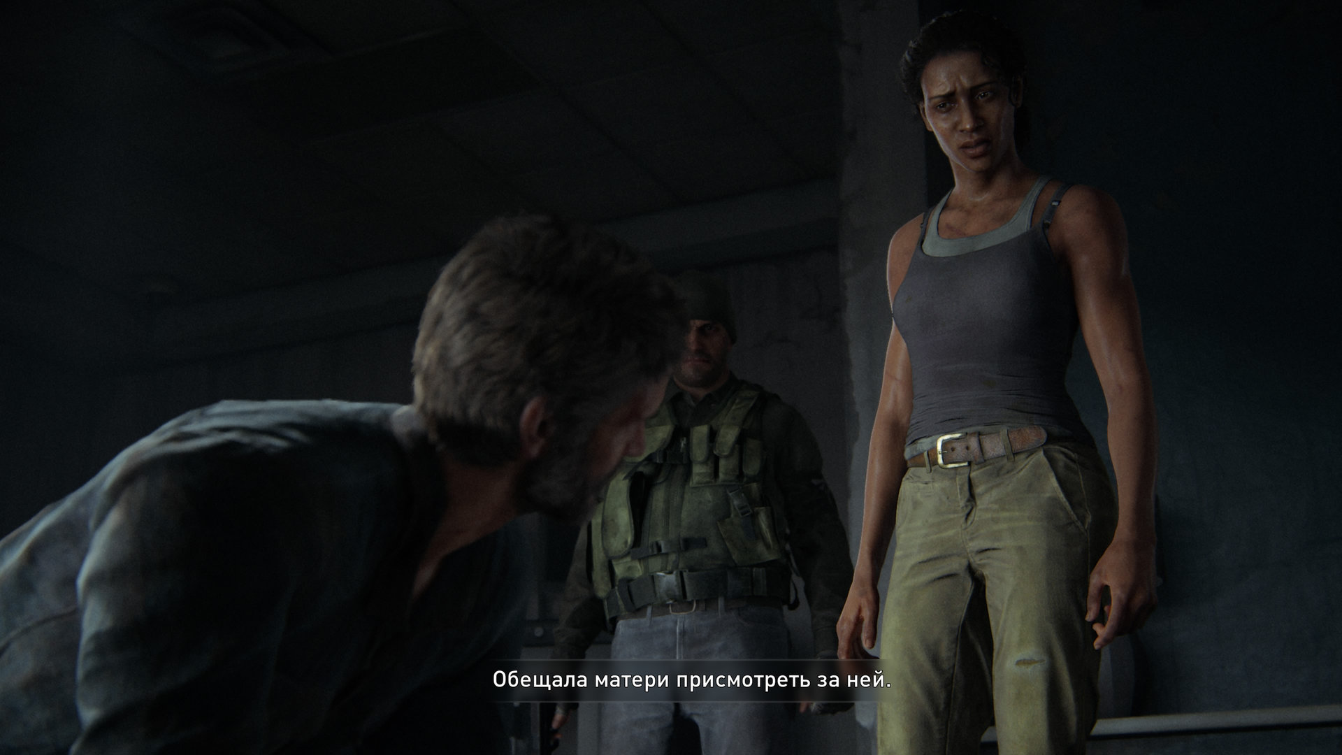 Самое важное здесь — главный герой не верит во все сказанное, тогда как напарница все-таки пытается склонить его завершить эту работу. В качестве главного аргумента Тесс: «мы уже зашли далеко, давай просто закончим это». И с напарницей Джоэла трудно не согласится, ведь останавливаться на полпути бессмысленно. Так, устами персонажа Тесс сценаристы задают ключевую максиму дилогии The Last of Us, которой пока что следует только она, однако в дальнейшем этим кредо будет руководствоваться уже другой персонаж.
