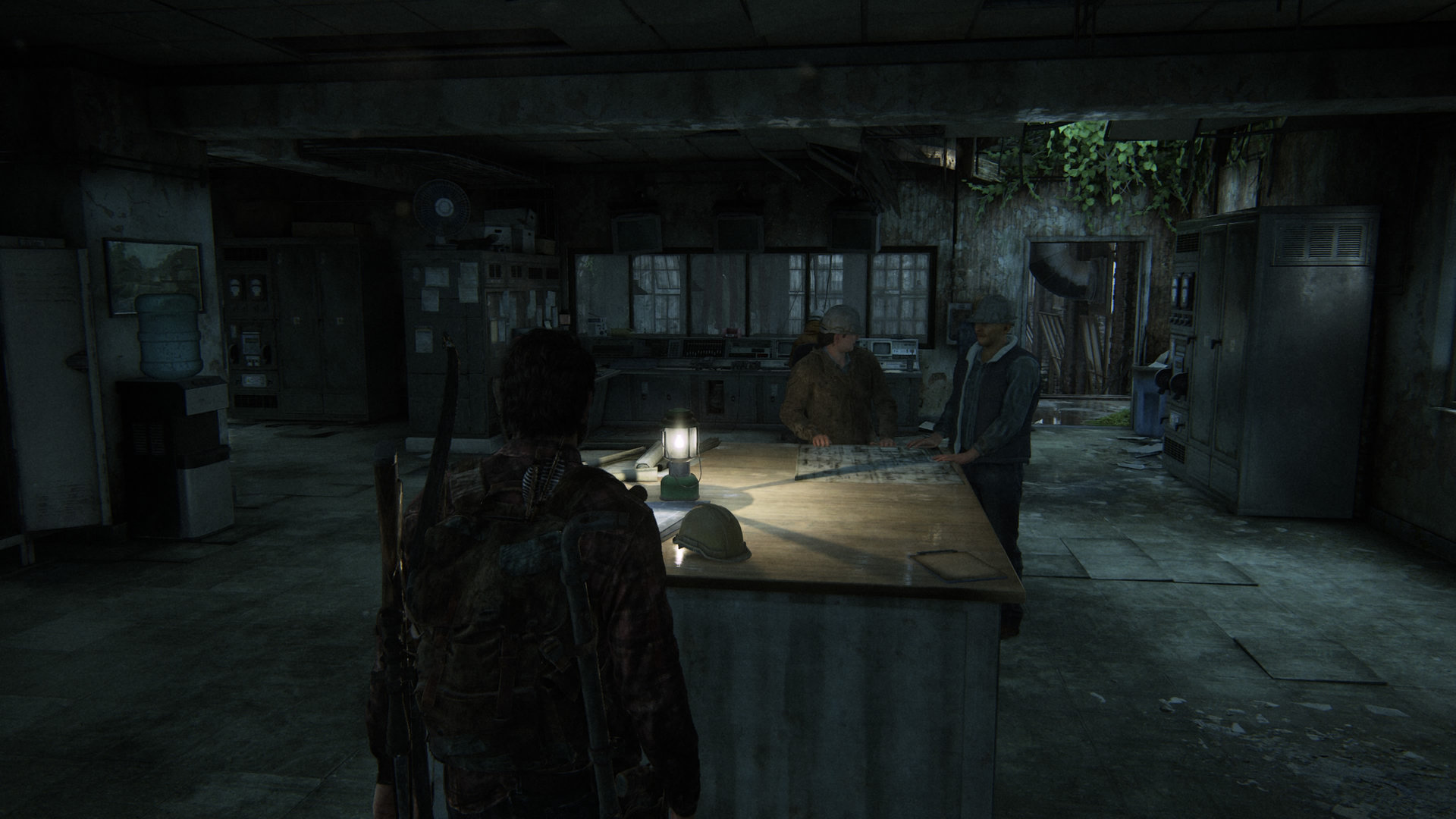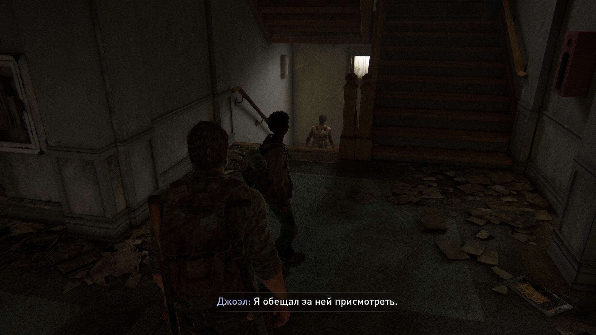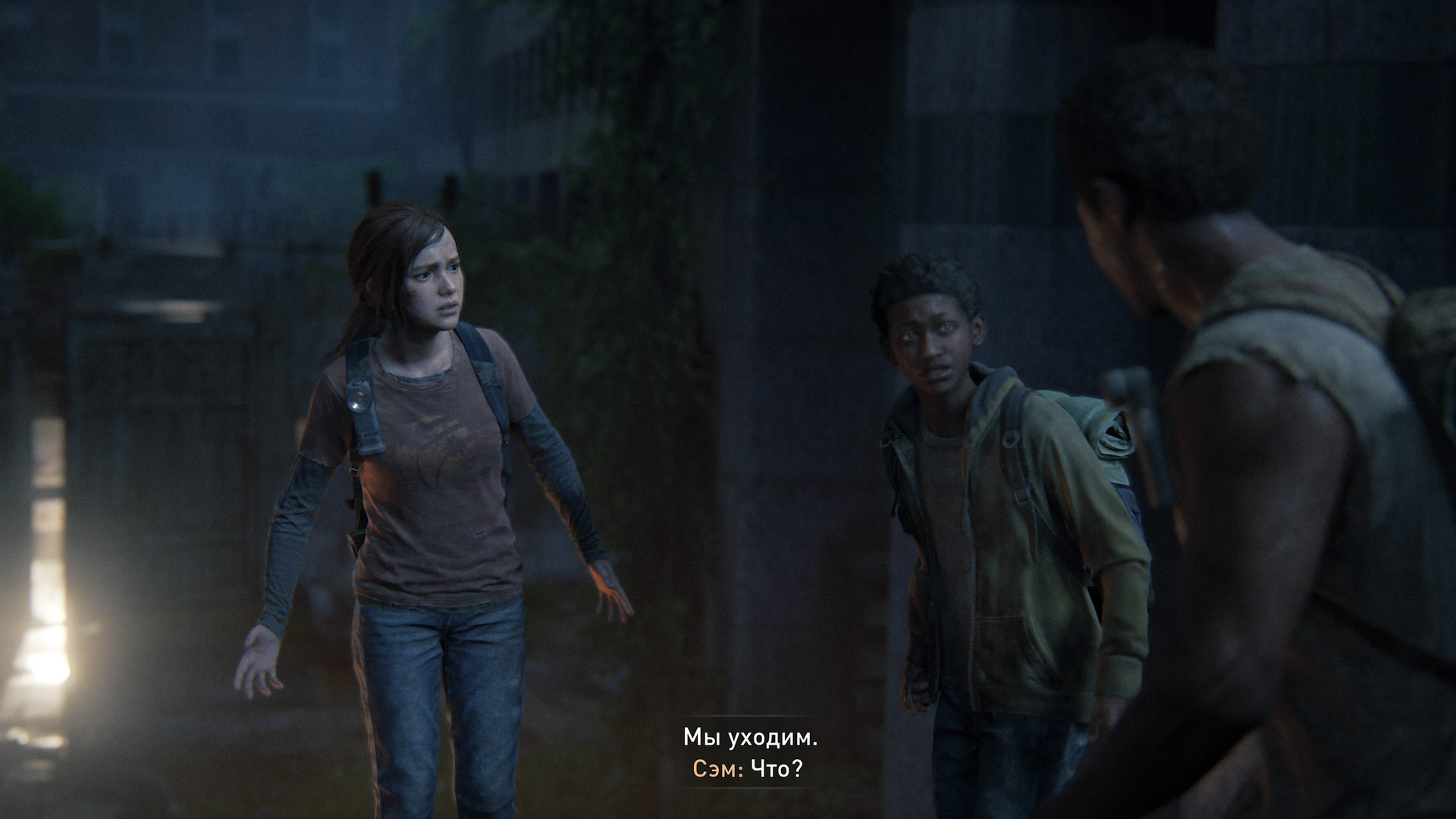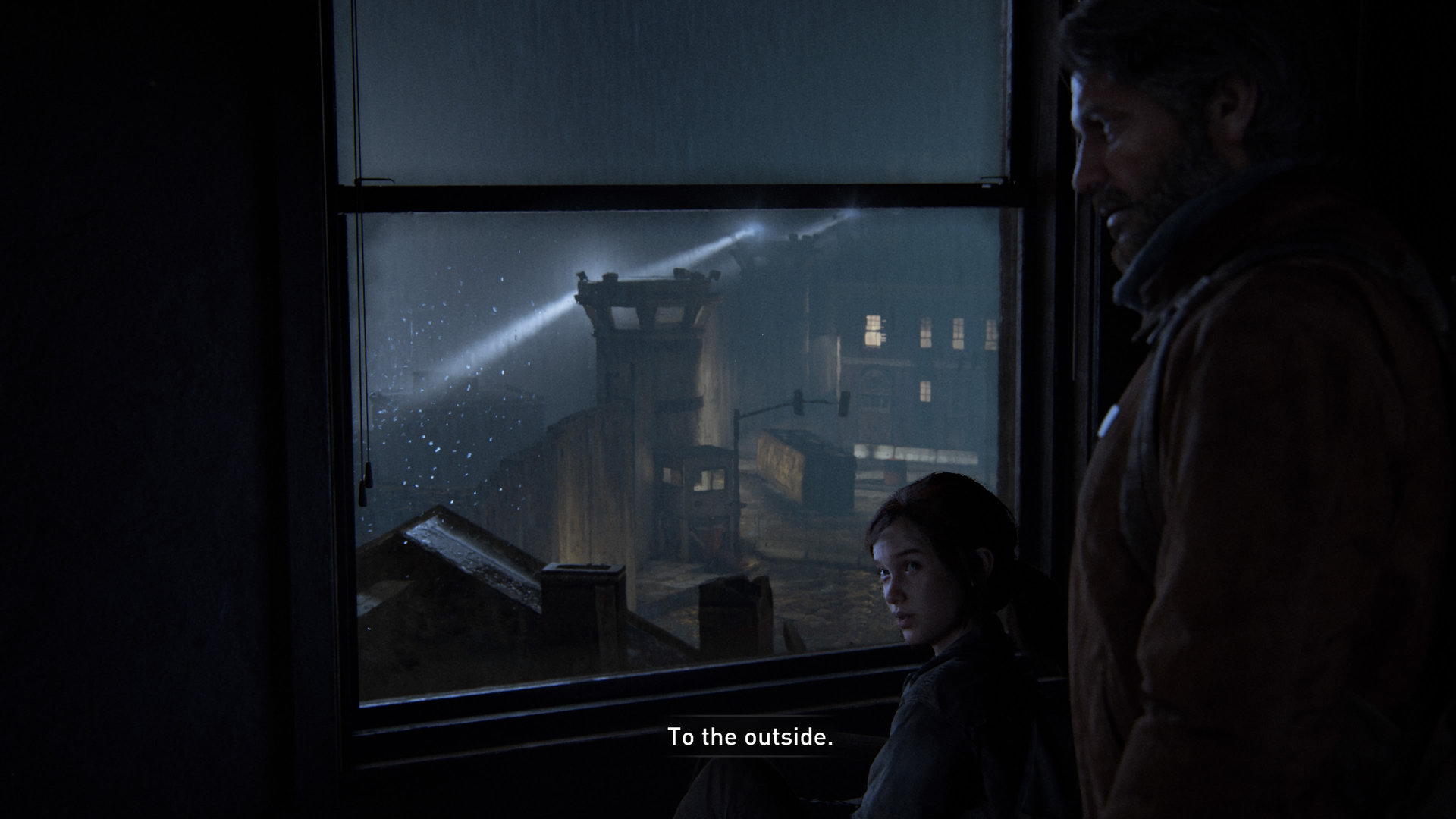 К моменту пробуждения Джоэла на улицу уже опустилась ночь. Следом к ним с Элли подоспела Тесс. Товар, за который они согласились доставить девочку, удовлетворил напарницу главного героя, так что группа персонажей готова выдвигаться. К слову, здесь впервые мелькает кадр, на котором Джоэл с Элли выглядят по-настоящему как отец и дочь.
