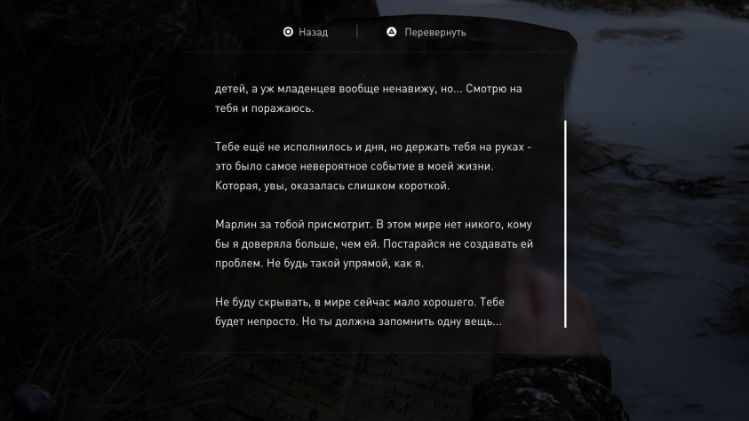 Здесь же впервые проскакивает важный для дилогии мотив The Last of Us — самопожертвовании родителя во имя жизни своего ребенка. Пускай мы лишены конкретики, однако Марлин заявляет, что Анна сделала все возможное, чтобы Элли выжила. Как выяснится позже, мать девочки скончалась спустя день после родов, что породило очевидную теорию о природе иммунитета Элли, про который ей только предстоит узнать.