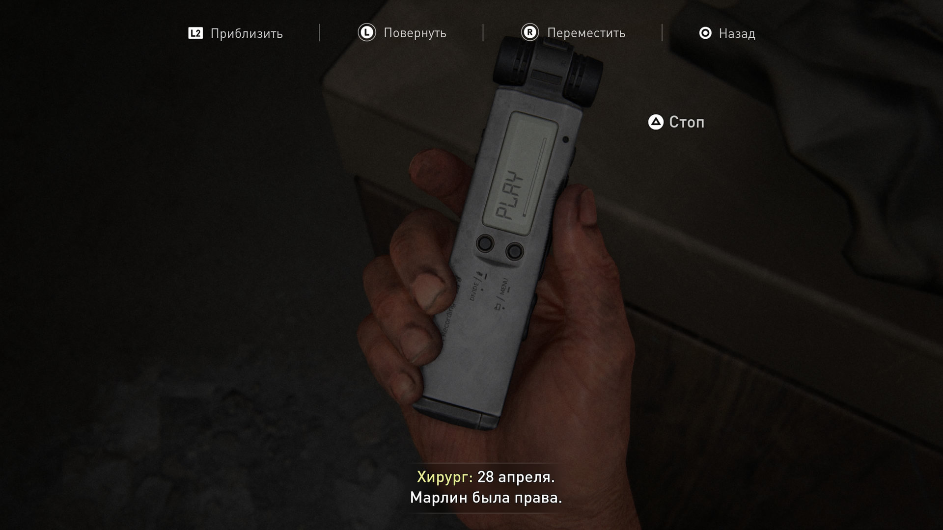 Режиссерские комментарии: в сцене, где Джоэл лжет героине о произошедшем в больнице, герой колеблется на словах Марлин о том, что умереть за попытку создания вакцины — это выбор Элли, потому что он знает, что таково было бы решение его дочери, если бы ее об этом спросили. В тот момент, когда Элли поверила, что ее иммунитет что-то значит, Джоэл по сути говорит ей, что это не так. Все, что сделала героиня, было зря (в ориг. «And everything you’ve done, it was for nothing»).