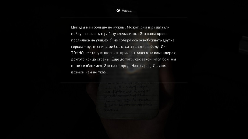 Привлекательность Цикад для людей мира TLoU не в их силе, а в том, что они обещают своей борьбой, и чего так не достаёт всем персонажам этой игры - возможности сделать свободный выбор. Да, они экстремисты. Да, они военизированы и уже давно пали в своих амбициях. И да, их обещания - ложь, которую они не могут оправдать. Но их идея в своей природе романтична. Поэтому так неудивительно, что в мире TLoU находятся люди, вроде Элли, с которыми эта идея резонирует так сильно.