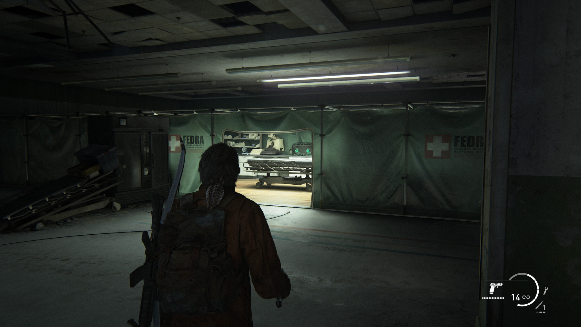 Однако стелс-миссия достаточно скоро проваливается — почти что на выходе главных героев ловит патруль FEDRA. Бойцы проверяли героев на предмет заражения с помощью специального прибора, но когда черед дошел до Элли, девочка не без заметного страха резко напала на не ожидающего такой решимости от ребенка военного. Джоэл и Тесс, привыкшие к форс-мажорам, оперативно берут контроль над ситуацией в свои руки и устраняют обоих патрульных.
