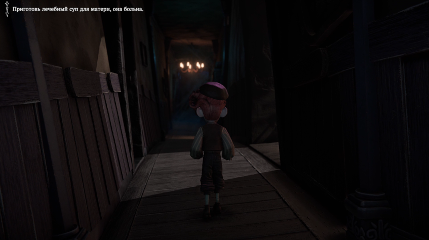 Перемещаемся в дом, где нас уже встречает атмосфера, противоположная саду — здесь все мрачное, темное, гнетущее. Предметы на кухне неестественно огромные и грубые, начиная от мебели и кончая кастрюлей, в которой, кажется, может поместиться и сам главный герой.
