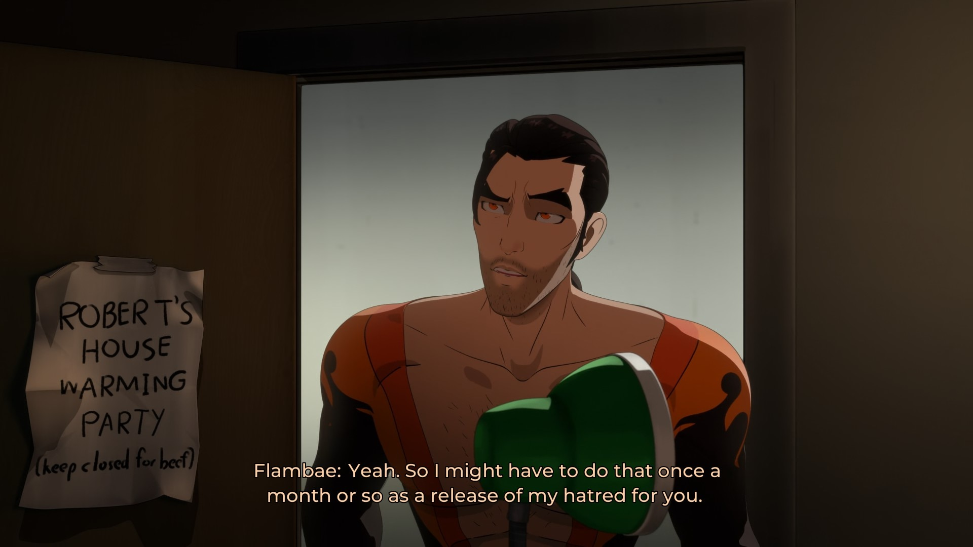 Один из моментов по плохой характеризации касается и самого Роберта, когда он швыряет в Фламбе дошираком. Я конечно понимаю, что Чад в той сцене слишком уж сильно начал наезжать на Водобоя, но во-первых, сам Водобой тут частично виноват — вначале выкинул еду Фламбе, а потом предложил её же, вытащив из мусорки. Прямо скажем, это не тот случай, когда злость на нерадивого уборщика совсем уж не оправдана.