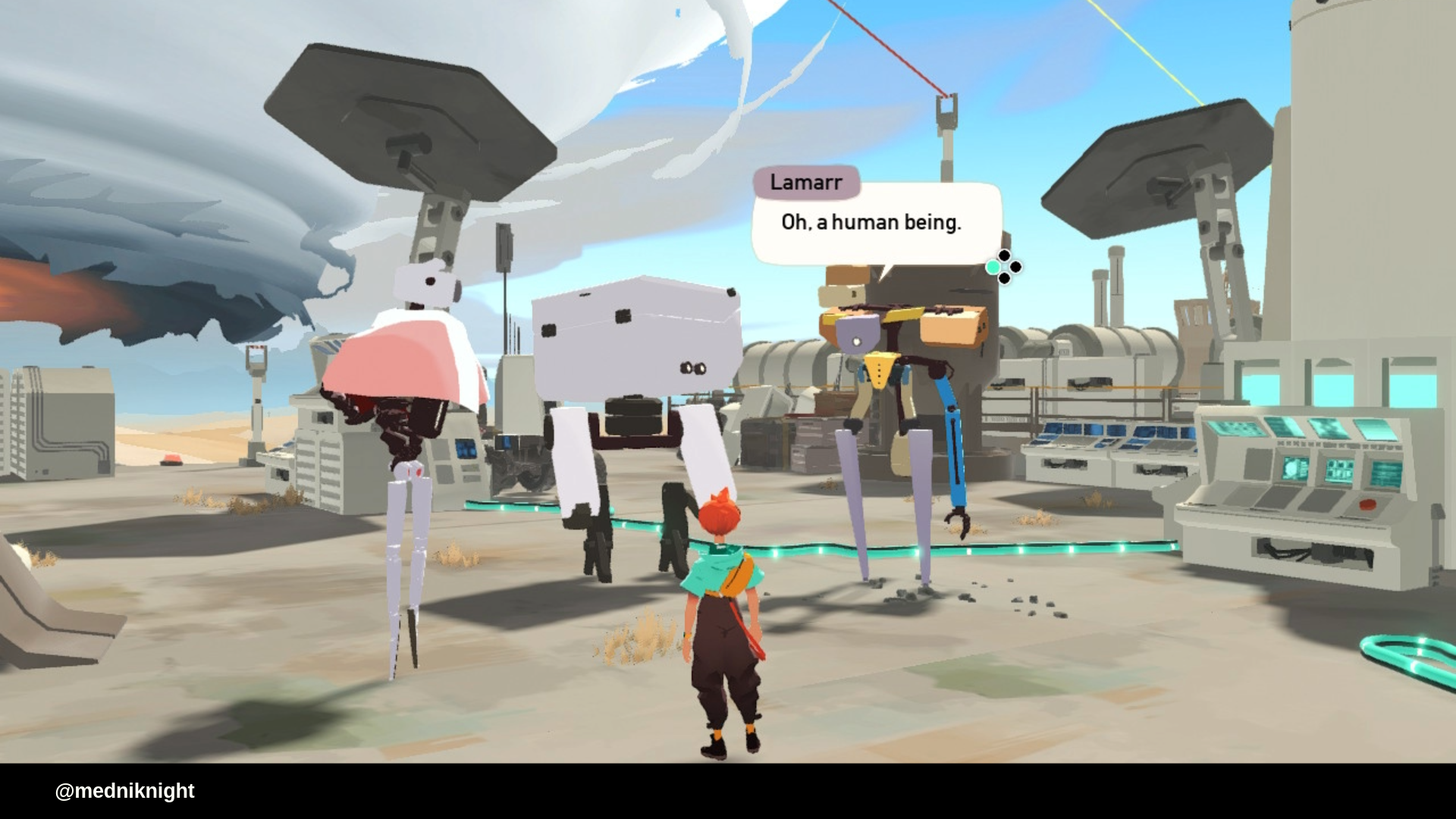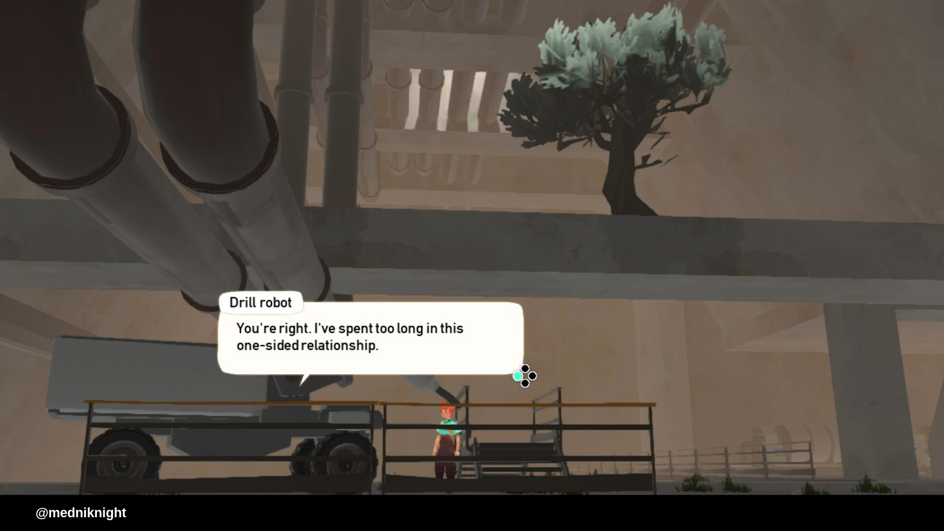 Есть ещё одна трогательная история, связанная с машинами. На скале возле дома той же Розы игрок может встретить почти разрядившегося робота. Если его включить, то он взлетит и направиться в сторону следующей скалы. Пробежав так несколько точек, вы сможете довести почти разрядившегося робота до его цели. Оказывается, он летел на встречу с другой машиной, своей возлюбленной. Он хотел в последний раз увидеть её, перед тем как отключиться навсегда. И вот вы наблюдаете за последним диалогом двух влюблённых машин, смотрите как они отключаются, оставляя вас наедине с шумом ветра. Что вы можете сделать? Только стоять, смотреть или уйти.
