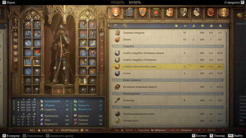Вообще, как по мне, у Warhorse крайне удачно получилось чисто техническую механику сохранения внедрить в сам мир игры. Да, студия в этом деле — далеко не первопроходец: про пишущие машинки и чернильные ленты из Resident Evil знает, наверно, даже мой кот. Но тут из-за системности игровых правил и функций всё воспринимается немного иначе. Шнапс можно найти, украсть, поторговаться на него с купцом, сварить самому — и с повышением навыка алхимии ты будешь варить больше единиц напитка за раз. Так ещё у него есть и несколько уровней качества, что влияет на дополнительные баффы.