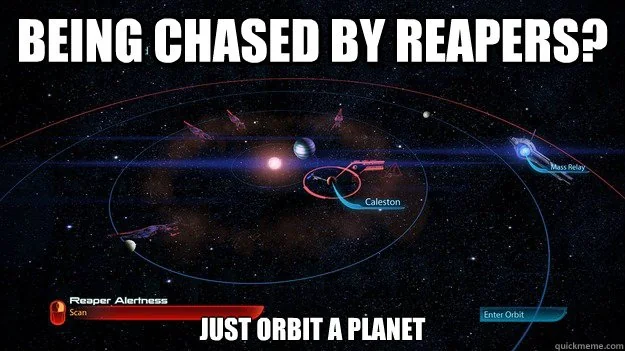 Жнецы в начале всей этой эпопеи находиться в, как говориться в самой игре, "Межгалактической пустоте", они находиться там пока не придёт время, и тогда они телепортируются на цитадель и уничтожают всю разумную жизнь. Но цитадель не работает после первой части, поэтому они отправляются в путь из этой пустоты на обычных двигателях, и спустя пару лет в третьей части они добираются до Галактики. У этого есть две трактовки, либо жнецы двигаются быстрее света без использования реле Массы, либо были супер близко и фактически никогда не покидали Млечного пути. Обе эти трактовки очень глупые, и мне это не нравится. Но это единственный выход для разработчиков, ведь иначе Шепард с ними никогда и не встретится, а это очень важно, многие фанаты наверняка ждали появления Жнецов и хотели посмотреть на них вблизи, хотели посмотреть что они из себя будут представлять. Но мне кажется игра могла бы быть гораздо интереснее, если бы прибытие Жнецов означало поражение Галактики.