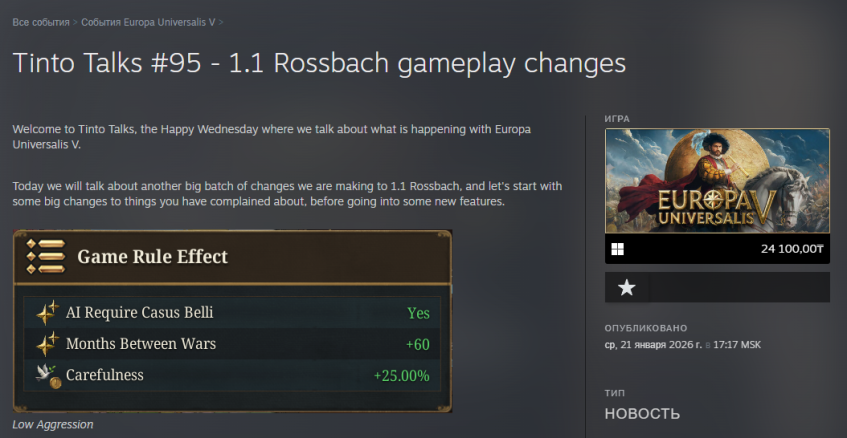 Прошло всего два месяца с выхода Europa Universalis V, а Paradox уже вовсю перекраивают игру. Свежий дневник разработчиков Tinto Talks #95 от 21 января 2026 года подводит черту под важным этапом — подготовкой масштабного патча 1.1 Rossbach. Давайте разберем, что изменится в нашей любимой глобальной стратегии.