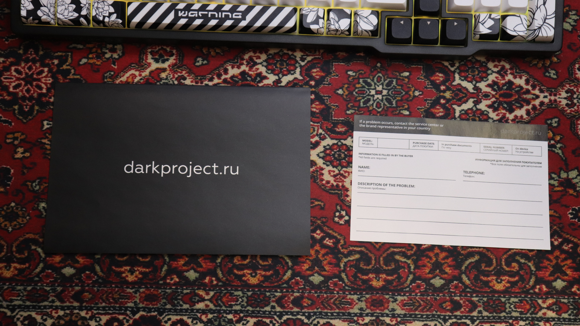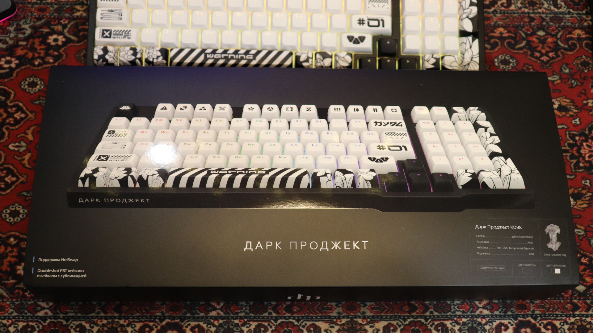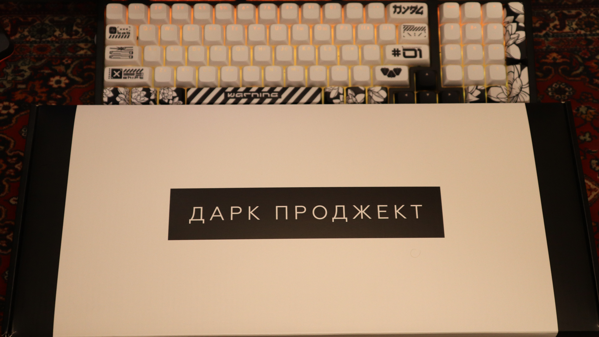 Коробка встречает нас «дорого-богато», картон плотный, приятный на ощупь, на вкладыше мы увидим внешний вид клавиатуры, и немного её характеристик, сняв его нас встретит надпись Дарк Проджект. Что особого сказать о коробке я не знаю, всё равно, как только вы достанете всё необходимое из нее, она отправится пылится на полку, но при желании можете и любоваться ей. Упаковано всё качественно, содержимое точно доедет без повреждений. Так-как отзыв пишу, уже используя клавиатуру, фото будут немного странные (да и фото так себе, приношу свои извинения). Анбоксинг можете глянуть на ютубе).