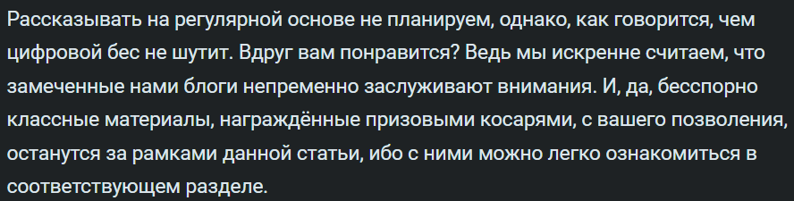 Что тогда, что сейчас, считаю, что нечто подобное действительно было нужно. И я рад, что подборки блогов закрываются не из-за того, что проект всем надоел или не смогли придумать куда толкать его дальше, а потому что Борода, как основатель рубрики, просто вышел на новый уровень. Это правда удивляет, что такой проект, с участием множества авторов, держался так долго, да ещё и на регулярной основе (вроде больше года уже подборкам?) Это действительно что-то с чем-то.
