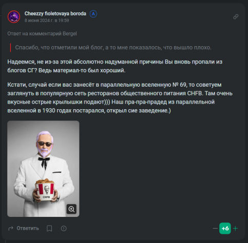 В итоге из соавторов подборки Чиззи с Бородой смогли собрать даже не какой-то там ragtag, а целый даже motley crue — разношерстную команду, рвущуюся писать точно любитель пива на фестивале раздачи бесплатного пенного. Окромя этого, сам наш фиолетовобородый харизматичный зазывала, ловко вертел идеями для подборки, и только благодаря этому сама идея и сама рубрика «крутые блоги» прожила так долго, подсвечивая действительно примечательных авторов и их работы. Пусть не всех удавалось заметить и приходилось защищать идею в комментариях, она жила, росла и цвела.