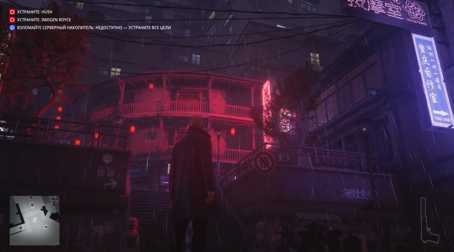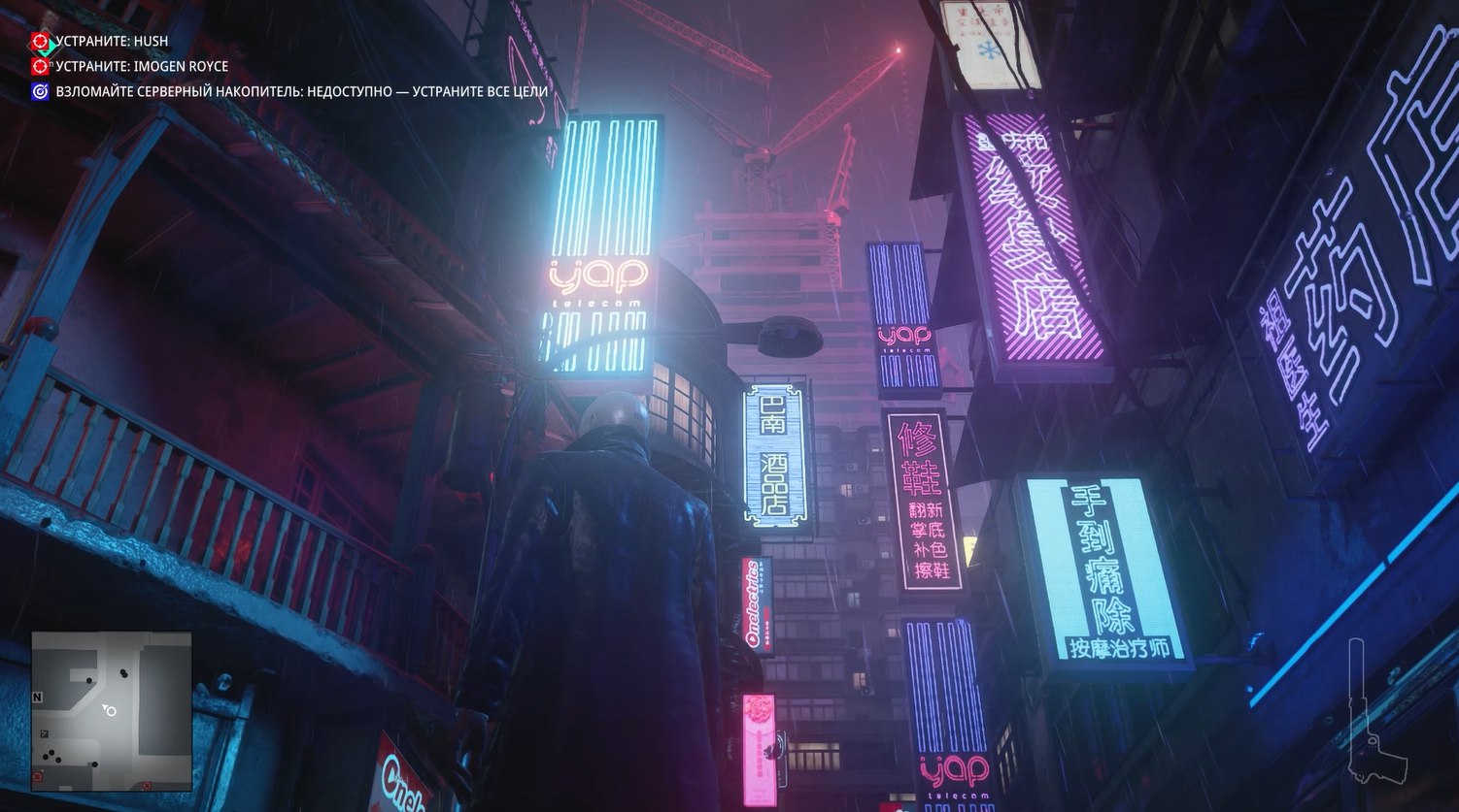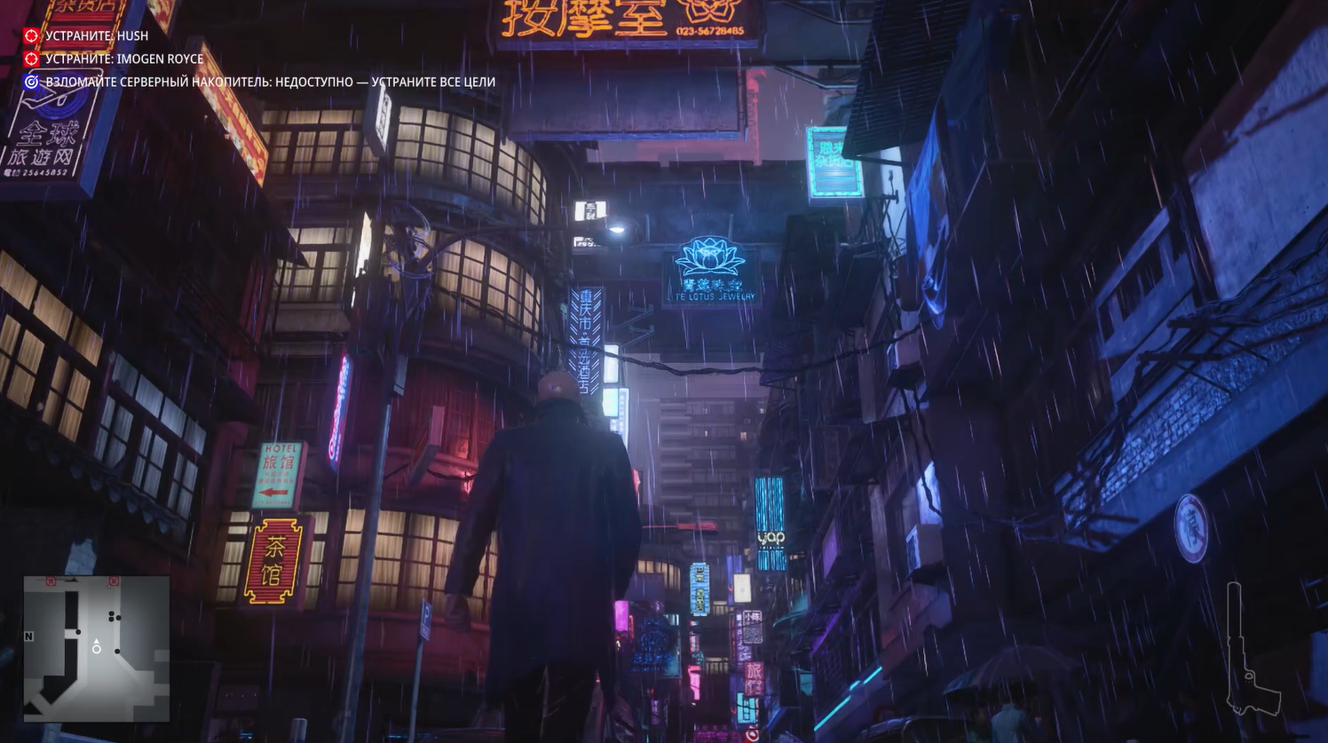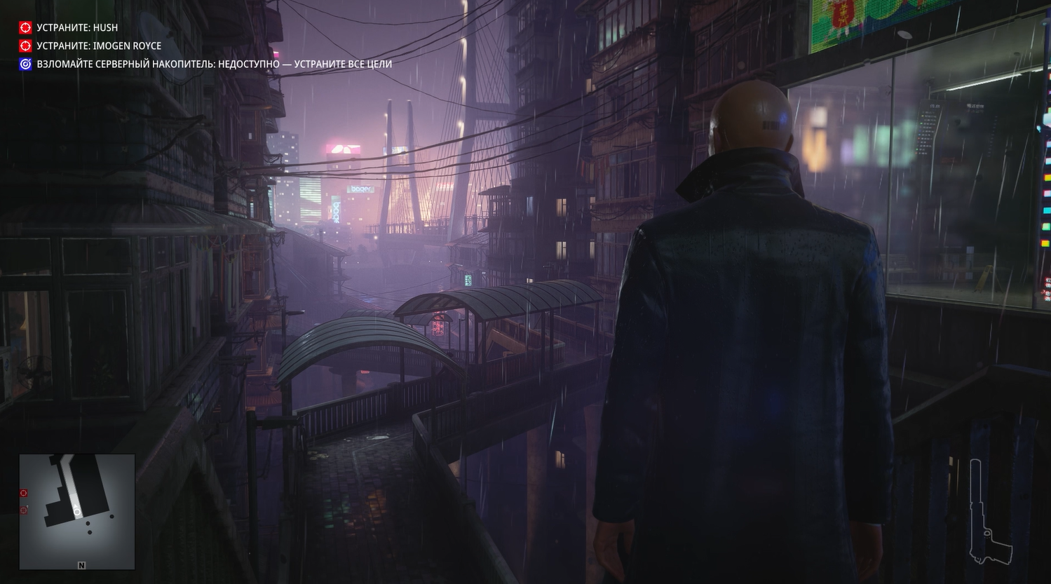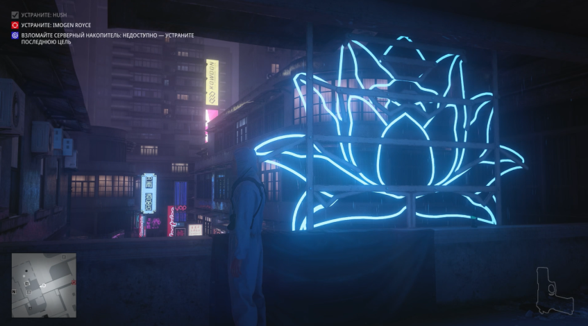 Без преувеличения это самая киберпанковая миссия из всех в Хитмане. Да она даже начинается с того, что Хитман стоит под дождем в плаще на фоне типичных лоу-тек застроек поблизости и хай-тек небоскребов, виднеющихся вдалеке.