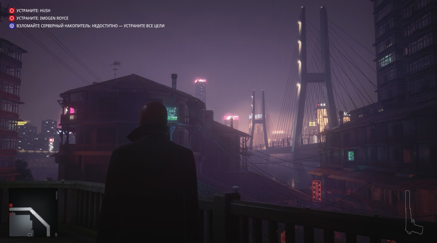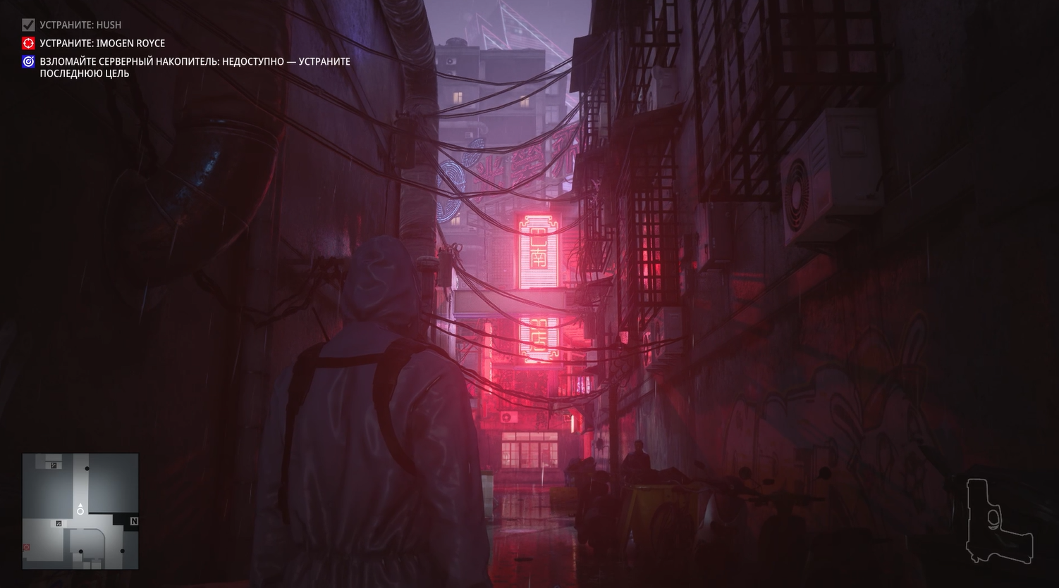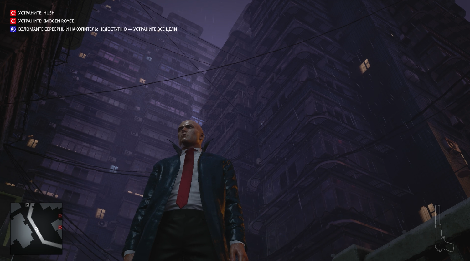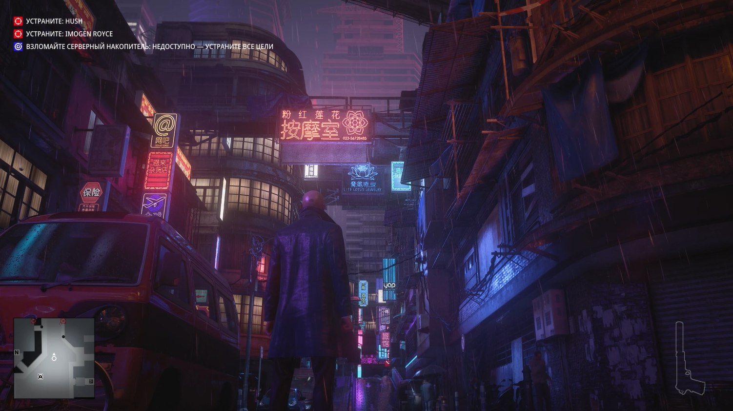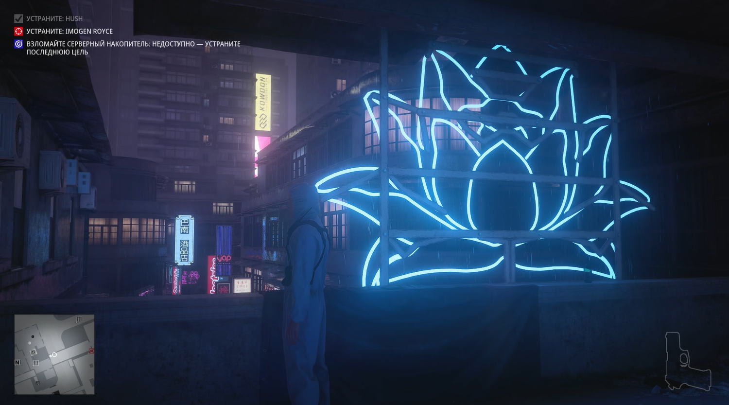 Без преувеличения это самая киберпанковая миссия из всех в Хитмане. Да она даже начинается с того, что Хитман стоит под дождем в плаще на фоне типичных лоу-тек застроек поблизости и хай-тек небоскребов, виднеющихся вдалеке.