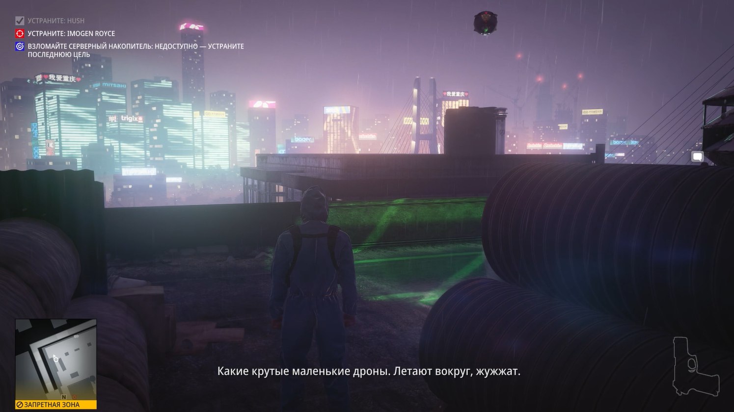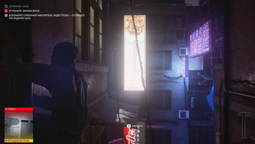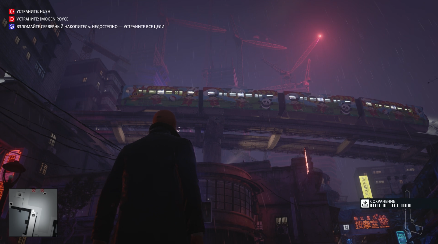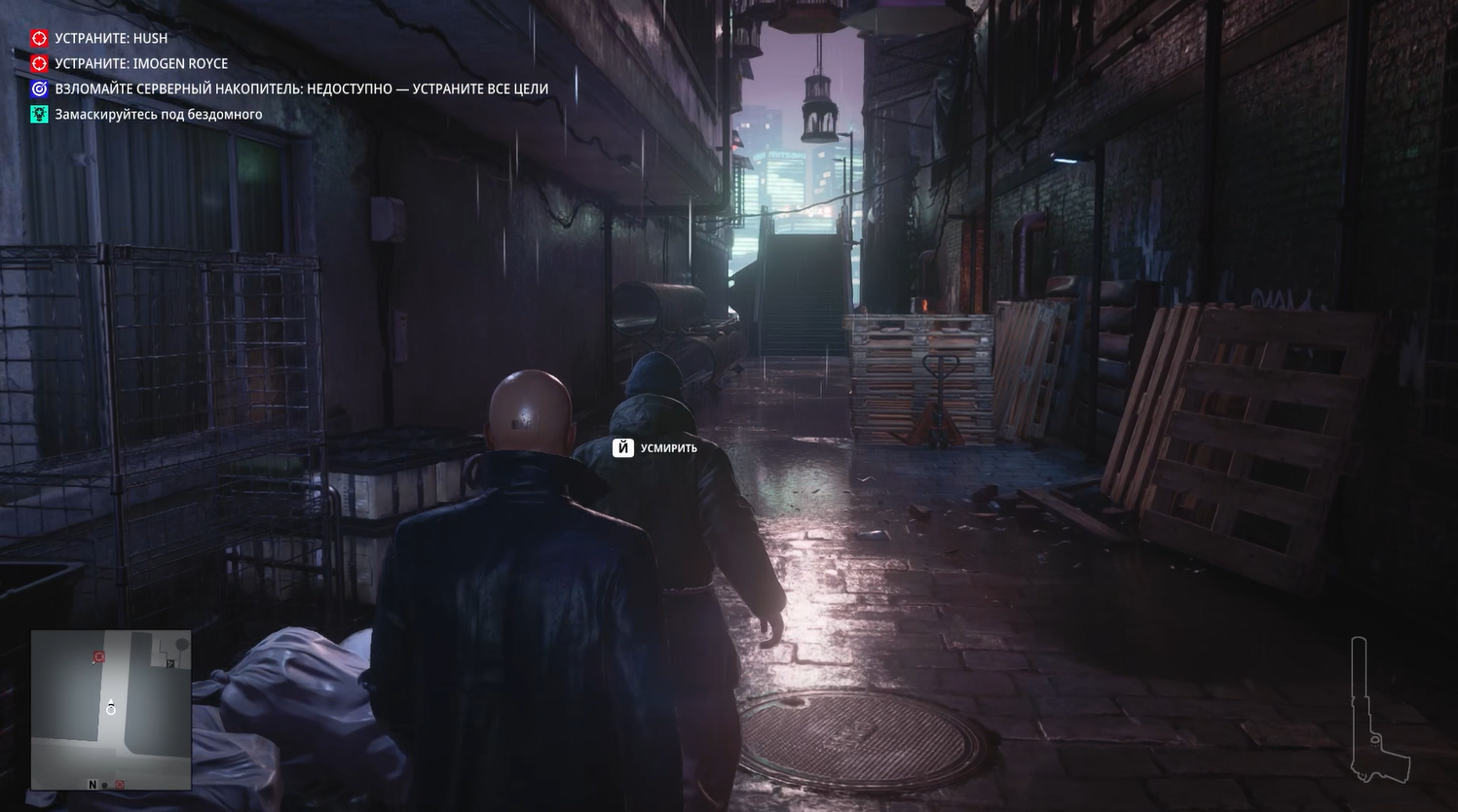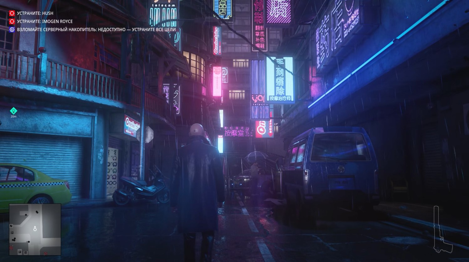 Без преувеличения это самая киберпанковая миссия из всех в Хитмане. Да она даже начинается с того, что Хитман стоит под дождем в плаще на фоне типичных лоу-тек застроек поблизости и хай-тек небоскребов, виднеющихся вдалеке.
