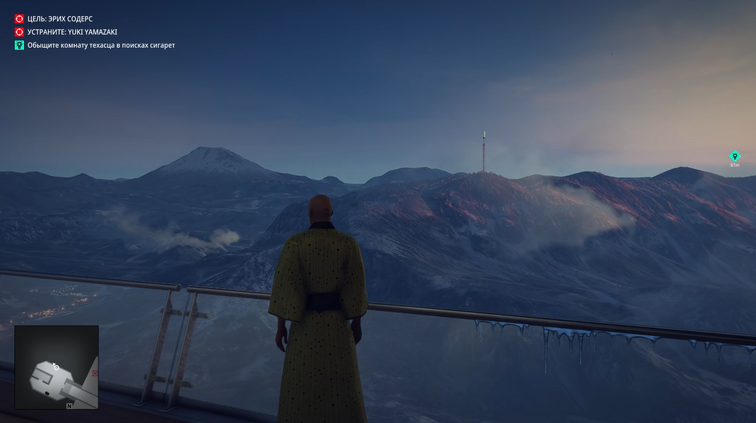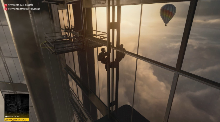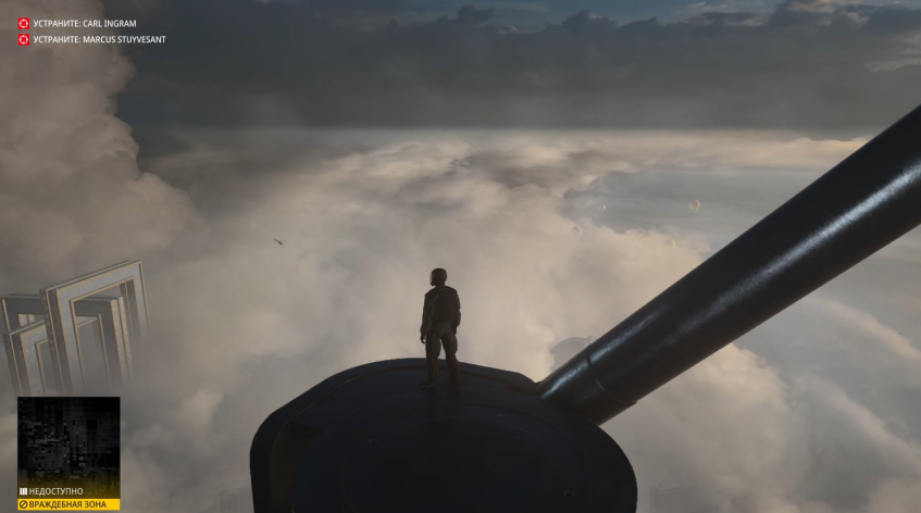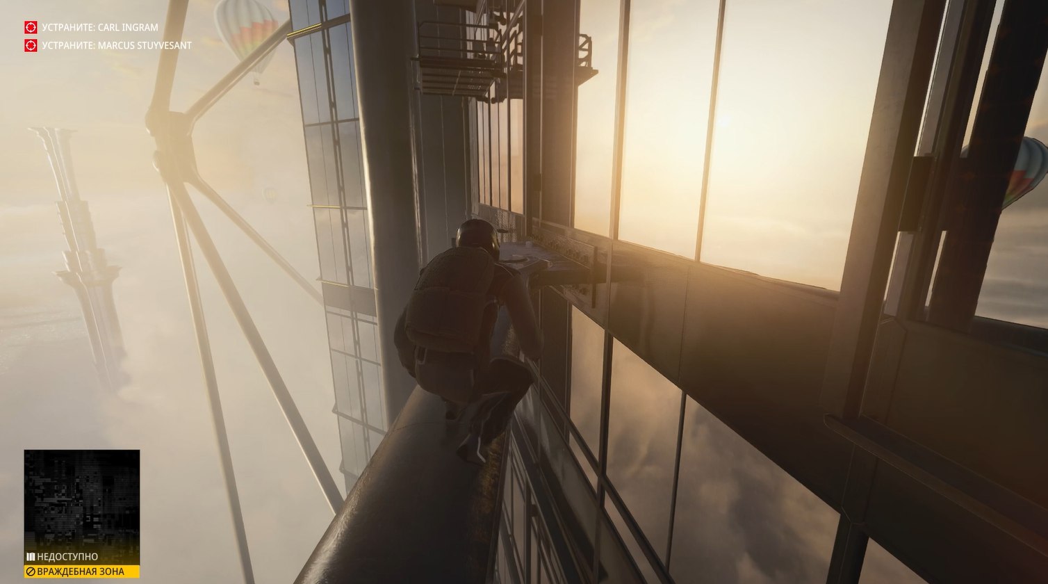 Собственно, с небес мы и прыгаем. Хитман в летном костюме с парашютом, аки заправский Том Круз, летит сквозь облака к этой башне, приземляется на какие-то внешние конструкции, осторожно идёт по ним, затем открывает окно и попадает внутрь.