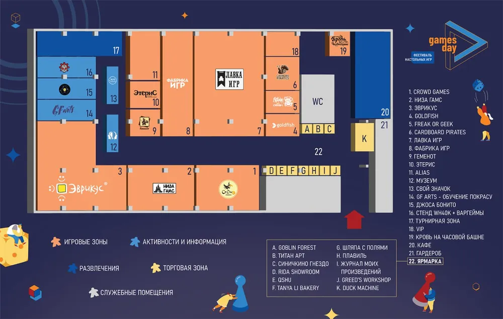 Начну с общей информации. Большая часть площадки была отведена под «игротеки» издательств «Лавка игр», «Эврикус», «Crowd Games» (не путать с «Crowd Republic» — это совсем другая компания, хотя тоже занимается настолками, но сфокусирована на краудфандинге), «Фабрика игр», «Низа Гамс», «Freak or Geek», «Геменот» и «Этерис». Там все желающие могли познакомиться с различными настольными играми под руководством специально обученных мастеров, знающих все тонкости правил. А ещё с каждой игротекой соседствовал стенд-магазин соответствующего издательства, где можно было купить понравившуюся настолку.