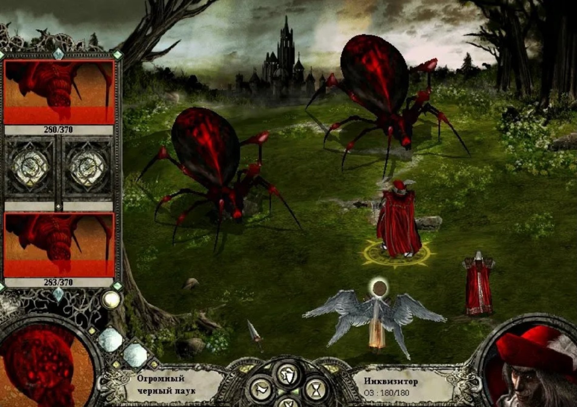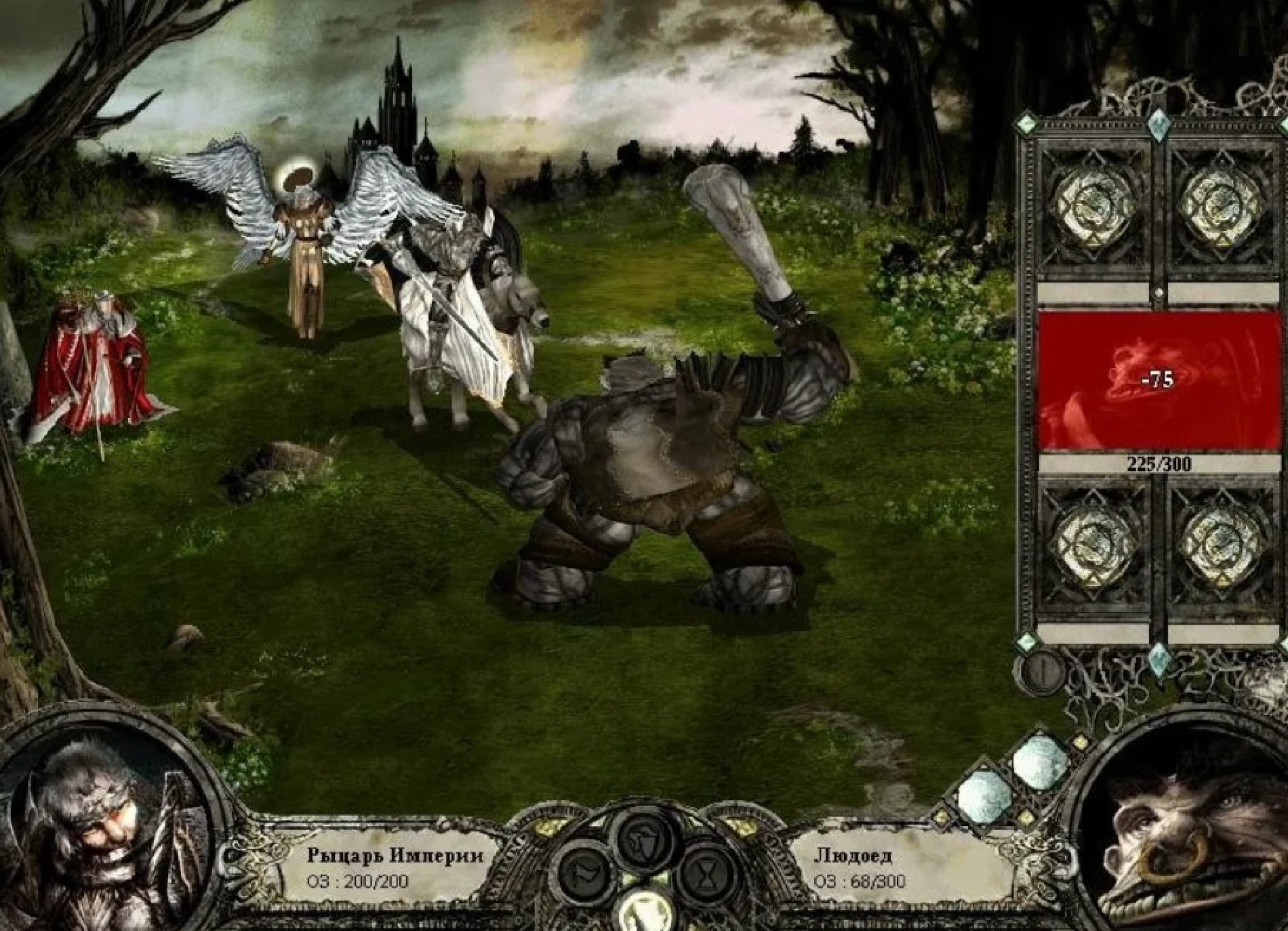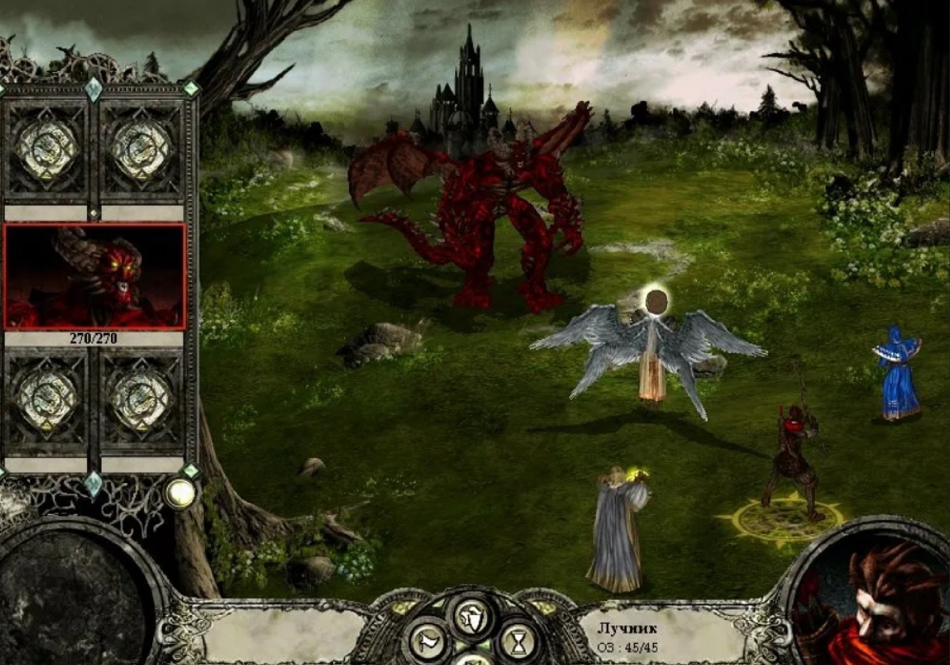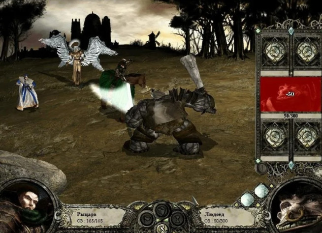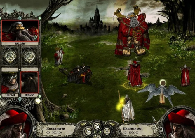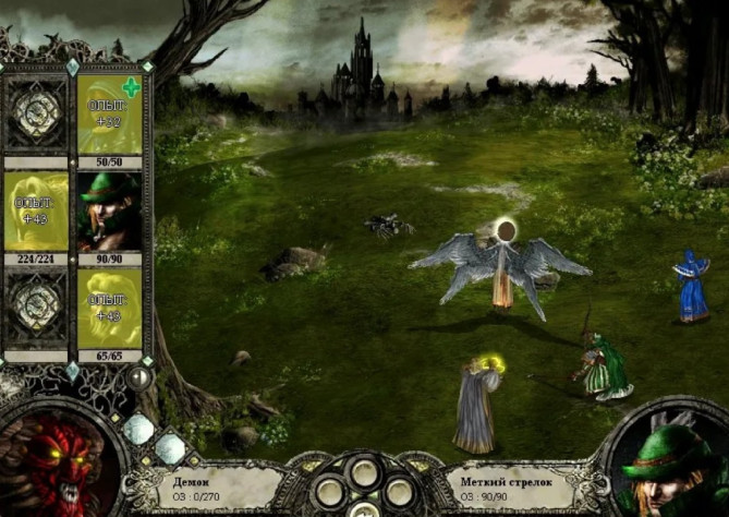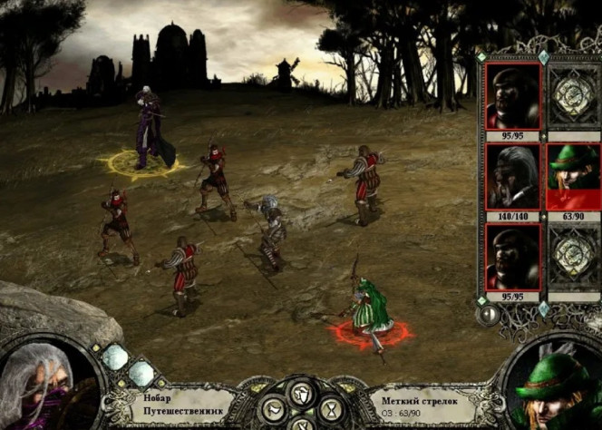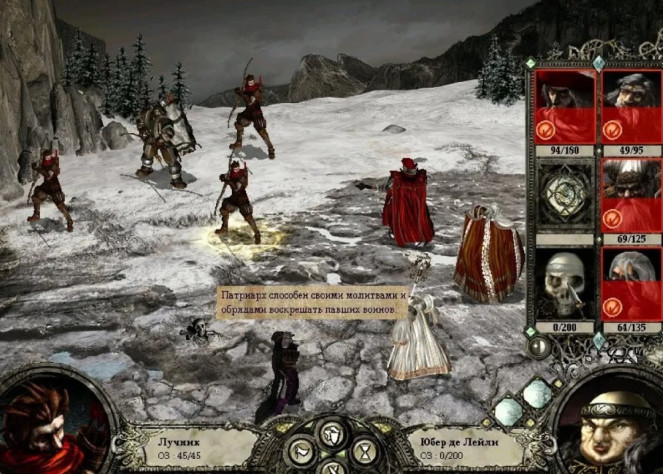 Остатки баронского отряда (кроме инквизитора!) также добиваются магией и лучниками. Теперь, когда в отряде барона остался один полуживой боец, он не сможет атаковать, как не сможет и воскресить Юбера де Лейли.