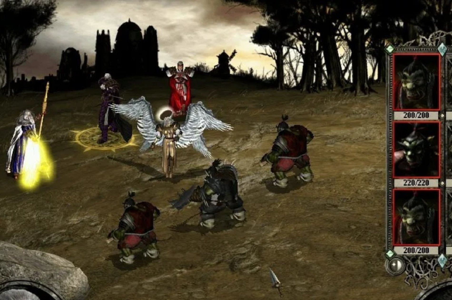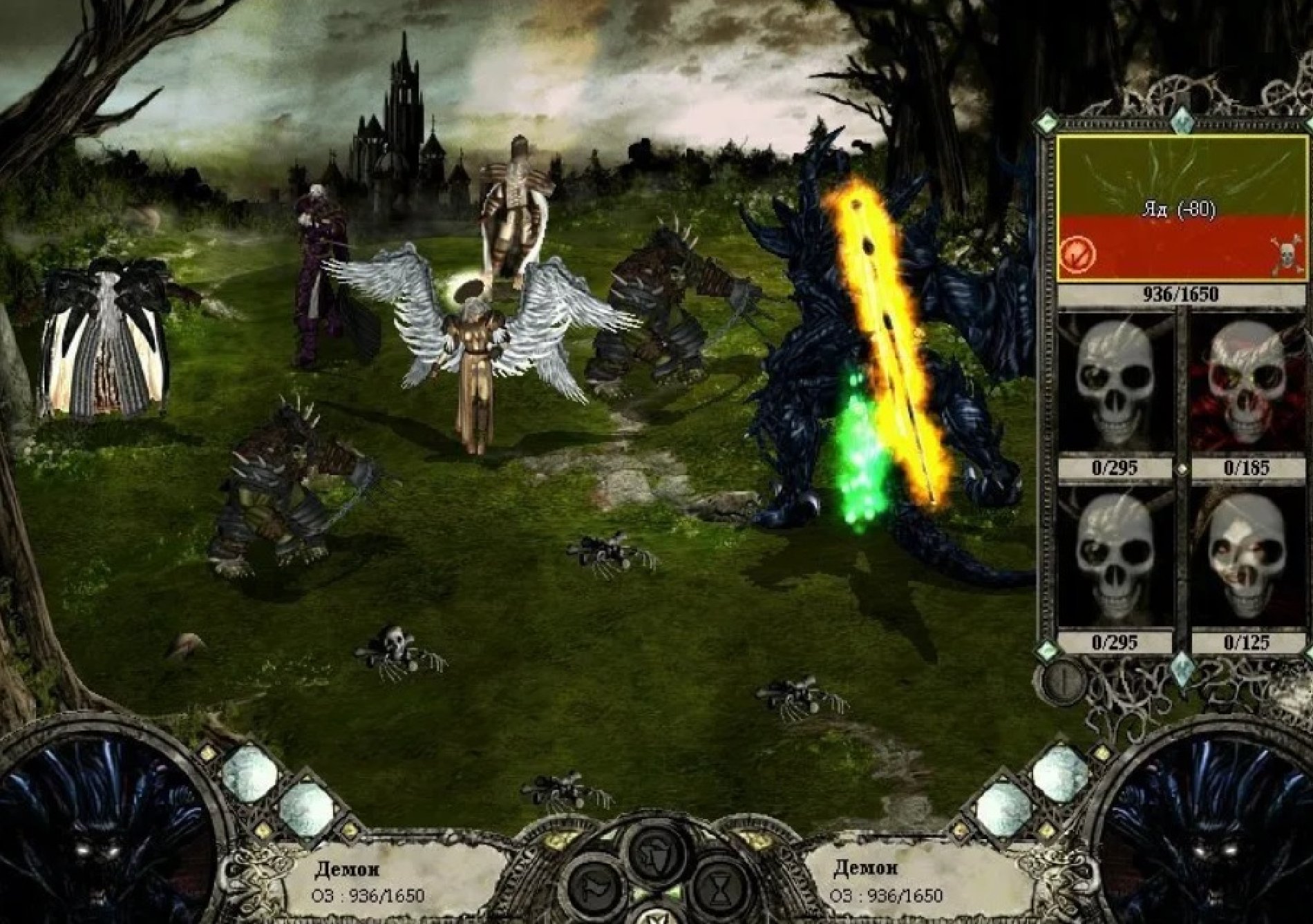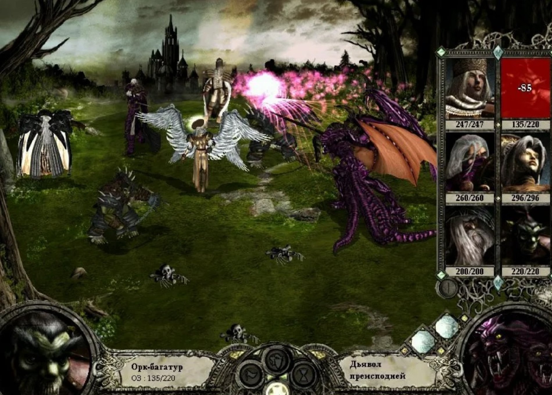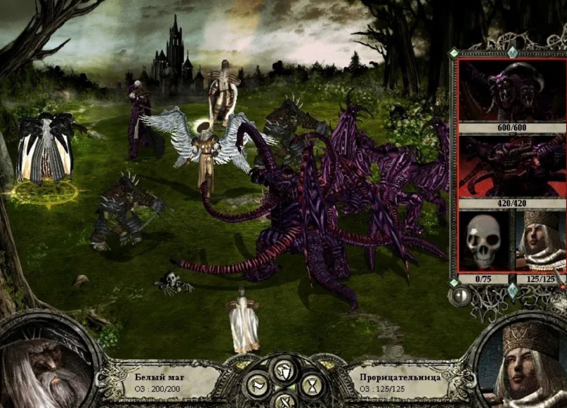 Остатки баронского отряда (кроме инквизитора!) также добиваются магией и лучниками. Теперь, когда в отряде барона остался один полуживой боец, он не сможет атаковать, как не сможет и воскресить Юбера де Лейли.