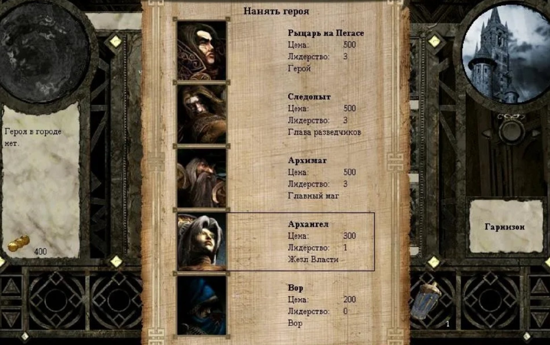 Остаётся Архангел. В отличие от боевых героев, может взять с собой только одного спутника. Зато не получает штрафов при передвижении, умеет лечить и водружать Жезлы, захватывая столь необходимые рудники. То, что нужно! Итак, решено: героем будет Архангел. Осталось определиться с лордом.