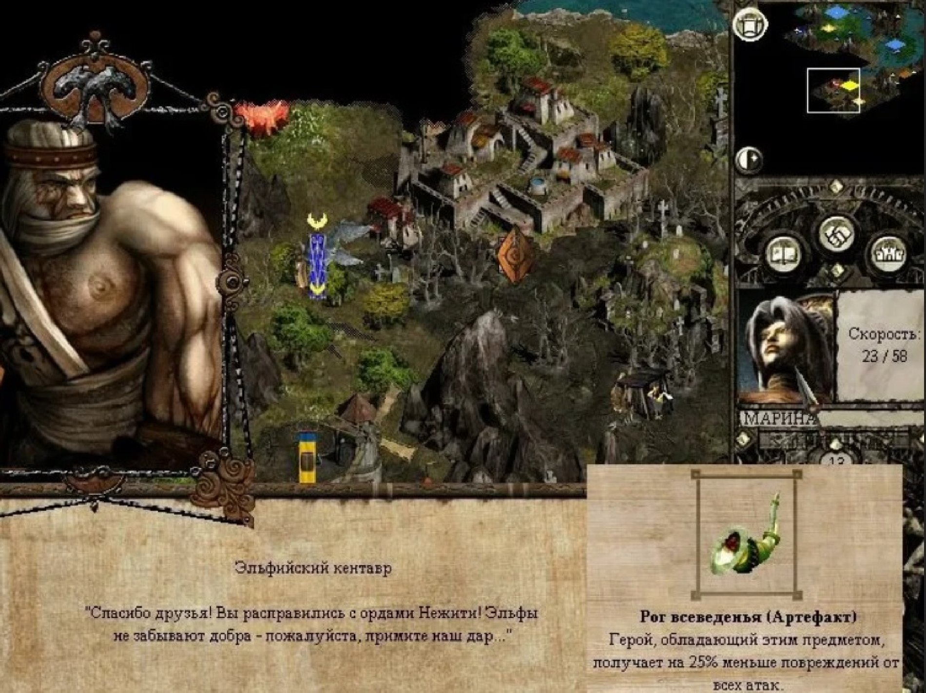 Продвигаемся дальше, уничтожаем отряд оборотней, двух титанов и подходим к магазину, в котором продаётся… заклинание гномов «Быстрота», восстанавливающее 100 % движения! Теперь наш Архангел сможет выиграть шесть боёв за день, хватило бы маны. Продолжаем движение на запад, пока в самом углу карты не находим одинокого эльфа.