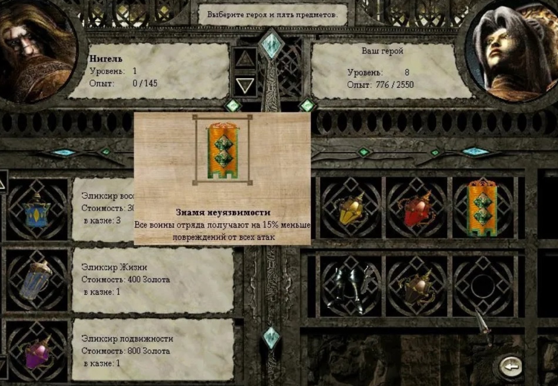 Победа! Переносим в следующую миссию эльфийские сапоги-скороходы, знамя неуязвимости и три эликсира: точности, защиты, силы.