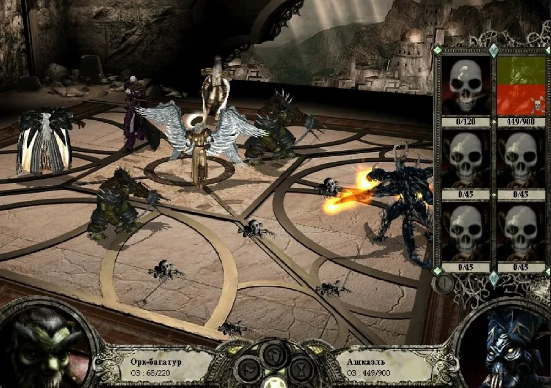 Но сунуться во второй зал побоялся… Доблестные варвары задержали врага, а с севера семимильными шагами прилетело возмездие и уничтожило дьяволов: на встречу с Архангелом подоспел Следопыт и привёл двух орков-багатуров: по 20 единиц брони, неплохая атака и защита.