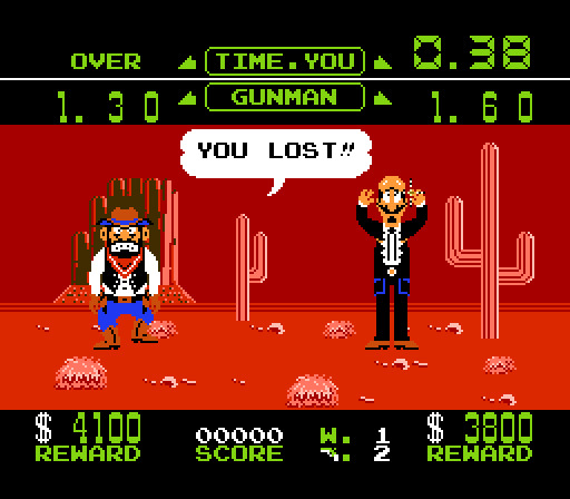 Сюжет в Wild Gunman отсутствовал, а режимы игры, по сути, были вариациями дуэлей с виртуальными противниками. После команды Fire! игроку давался короткий промежуток времени для совершения выстрела. Главная цель — опередить оппонента. Не успели или пустили пулю мимо экрана — ждите беды, ведь компьютерный соперник в ответ не промахивался. С каждым новым раундом счетчик на таймере уменьшал свои значения. Что интересно, меткость важным параметром не была: для победы достаточно просто направить пистолет в сторону враждебно настроенного ковбоя и быстро нажать на курок. Мы в детстве этого не знали и старались, как Клинт Иствуд, стрелять наверняка.