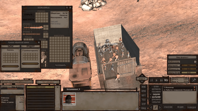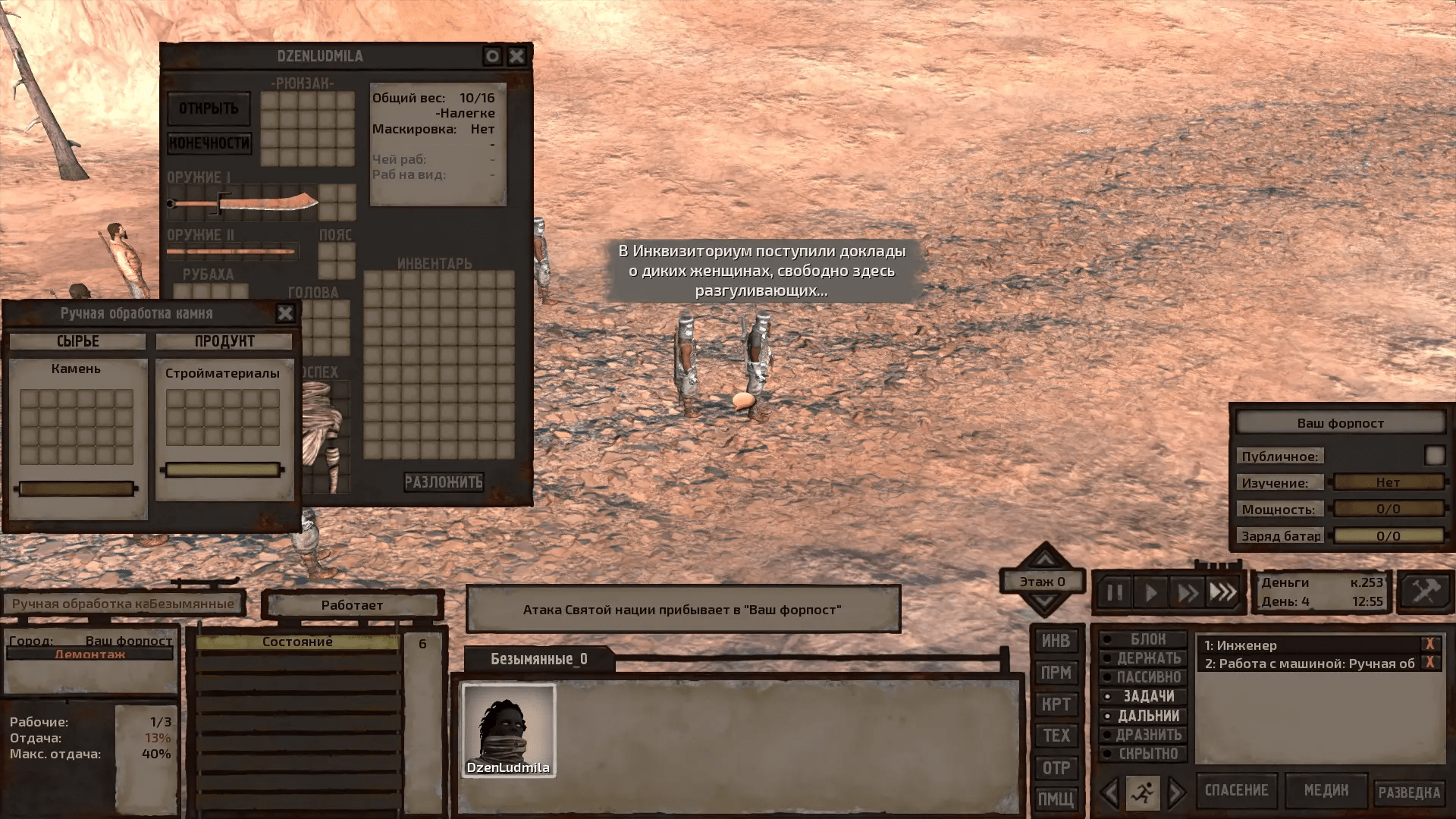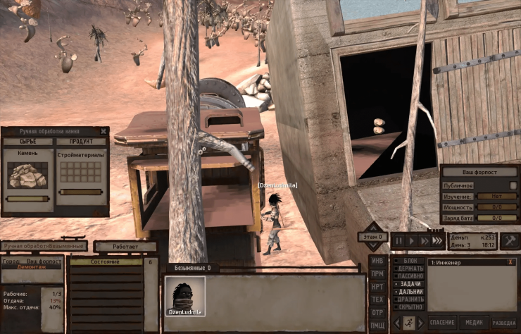 4 игровых дня моя протеже, как ломовая лошадь, не зная сна и голода, стучала киркой, чтобы сбыть добытое и на вырученные деньги возвести сарай своей мечты, откуда и начинается большой крафт. И надо было такому случиться, что через мою стоянку шествовала группа каких-то фанатиков-мизогинистов, которые не смогли стерпеть зрелища того, как гордая и независимая женщина обслуживает саму себя, да без Pater familias за спиной. Ребята рукоприкладствовать не стали, но обещали сообщить куда надо. И меня, конечно, посетила мысль, что хорошо бы переехать, но я уже вложил значительные усилия в это маленькое предприятие, уже чего-то добился — да и неужели этому их гранд-инквизитору в самом деле сдалось преследовать одинокую самостоятельную бабу в пустошах?