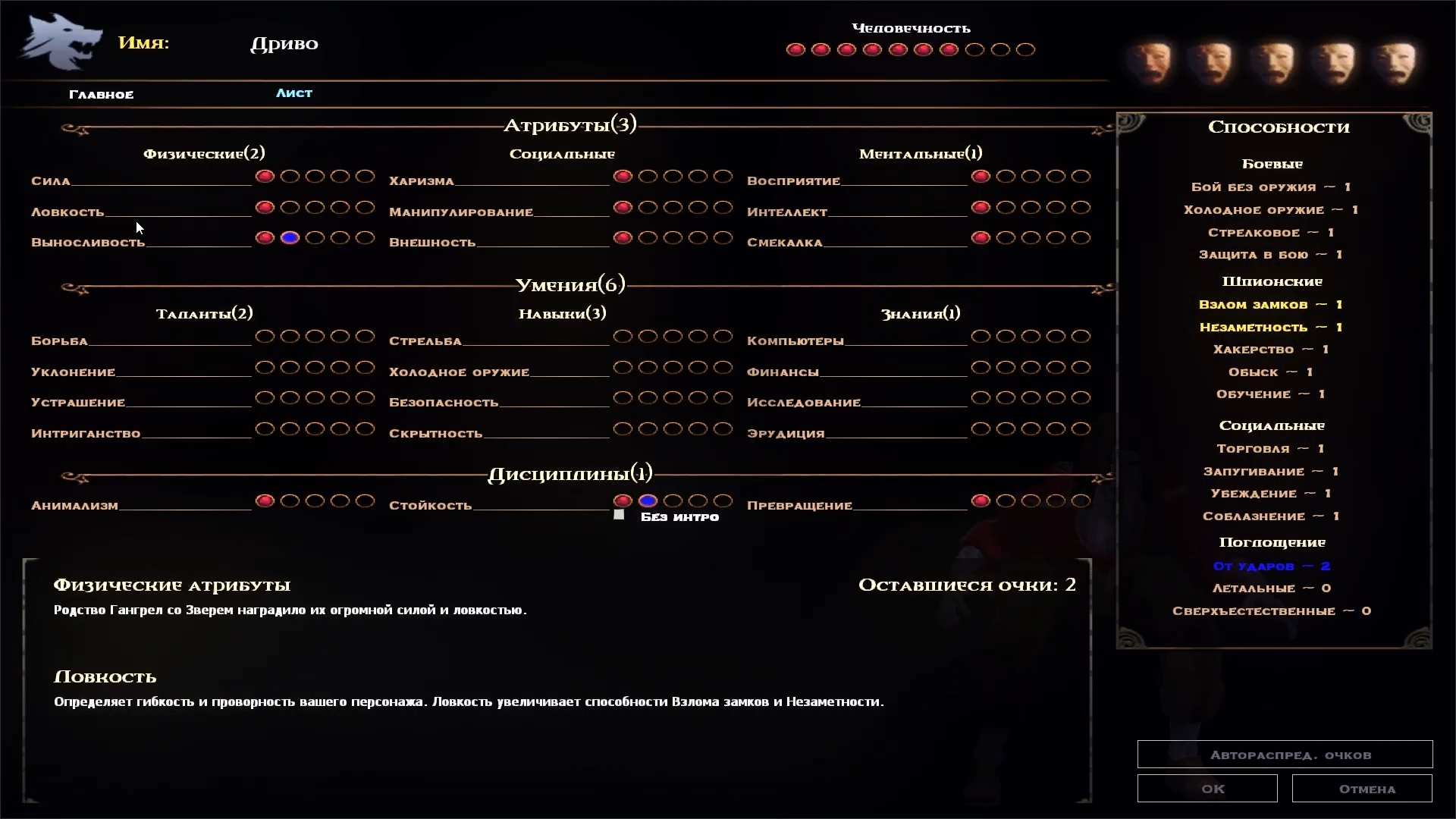 В своем прохождении я выбрал Гангрел, так как я хотел пройти игру за милишника. Так же я уделял внимание внешнему виду и прокачке персонажа, возможность стать зверем, меня заинтересовала.