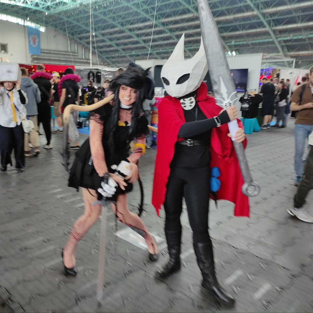 М.- Ну да, действительно. Игра только вышла, косплей был не доделан, но я была вообще единственной Хорнет на фестивале. В позапрошлом году я видела косплей Хорнет и надеялась, что хотя бы ещё 2 или 3 будет помимо меня косплея, но я удивлена, что была единственной, хоть и радуюсь, что там ещё в тот день был полый рыцарь и Квиррел. Нам точно удалось выделиться. Человека с красным плащом сложно не заметить в толпе.