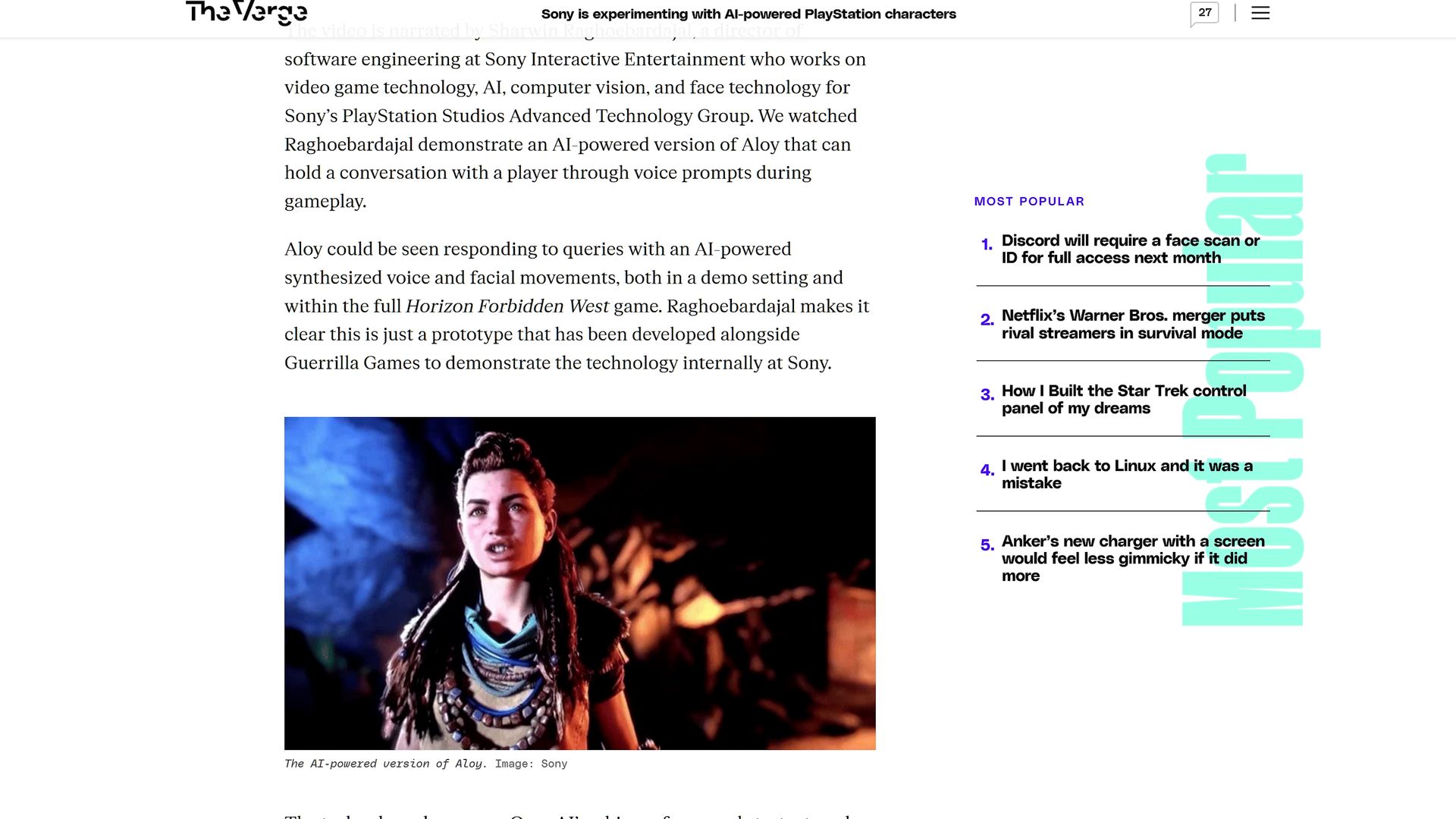 Однако, в 2025 году в сеть утекло внутреннее демонстрационное видео Sony с техническим прототипом, в котором ИИ-модель через персонажа Элой из Horizon: Forbidden West в реальном времени отвечала на вопросы пользователя — голосом и через изменение мимики. Это не было частью игрового процесса, а скорее выглядело как технодемка новых возможностей. Материал быстро удалили по требованию правообладателя, а Sony так и не сделала никаких официальных анонсов. [Источник]