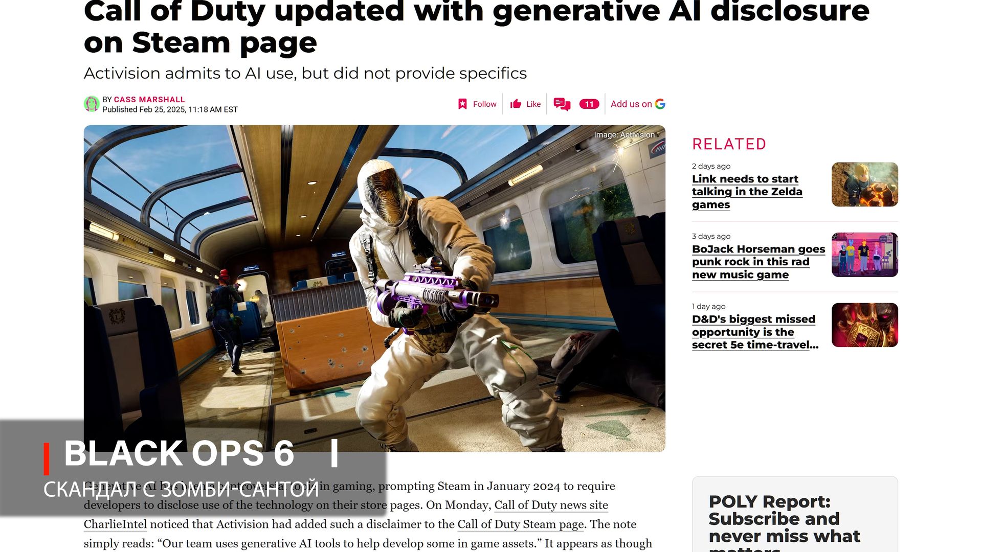 История быстро разошлась по соцсетям и стала наглядным символом претензий к сгенерированному ИИ контенту. Позднее выяснилось, что ещё в январе 2024 года Activision добавила на страницу игры дисклеймер о том, что при разработке некоторых внутри игровых ресурсов используются инструменты генеративного ИИ — формально, для соответствия требованиям площадки Steam. [Источник]