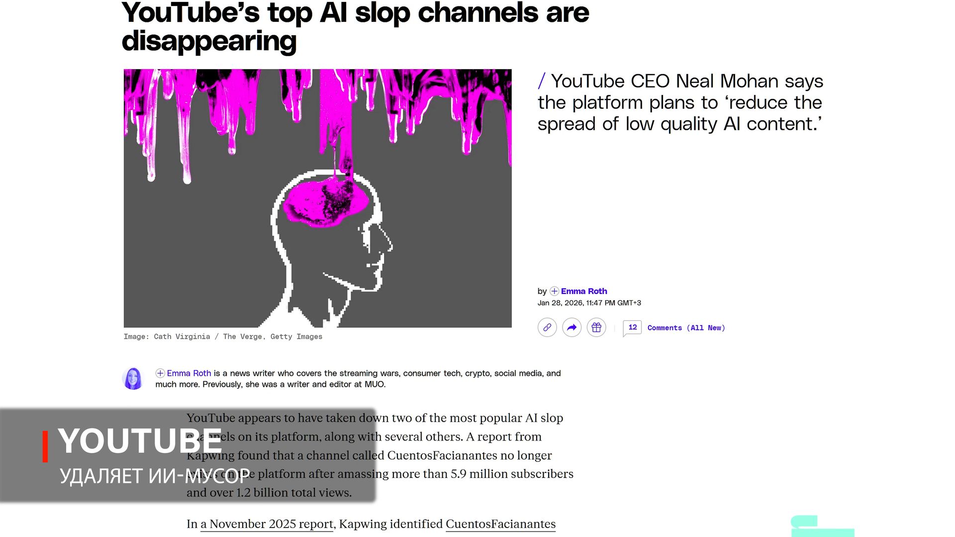Показательно, что речь идёт уже не просто о «личных ощущениях», а о явлении, на которое вынуждены реагировать крупные платформы. Так, в январе 2026 года YouTube начал удалять крупные каналы, которые собирали миллиарды просмотров на сгенерированных ИИ роликах — как раз из той самой категории «ИИ-мусора», о которой шла речь выше. При этом у двух удалённых каналов было более двух миллионов подписчиков. [Источник]