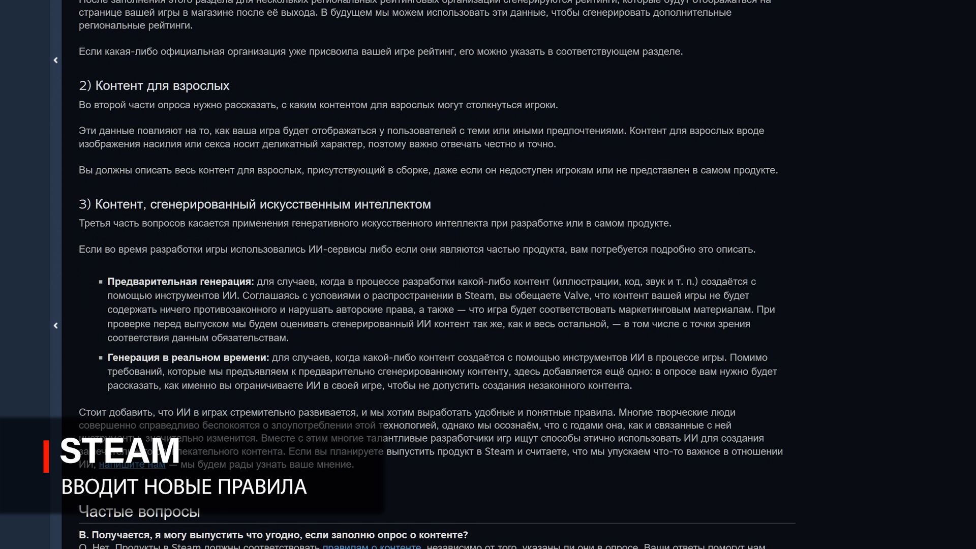И наведение порядка уже началось. Так, в 2024 году Steam официально обязал разработчиков раскрывать использование генеративного ИИ, различать заранее созданный контент (pre-generated) и контент, генерируемый непосредственно во время игры (live-generated), а также описывать механизмы защиты от воссоздания в игре незаконного или нежелательного контента. [Источник]