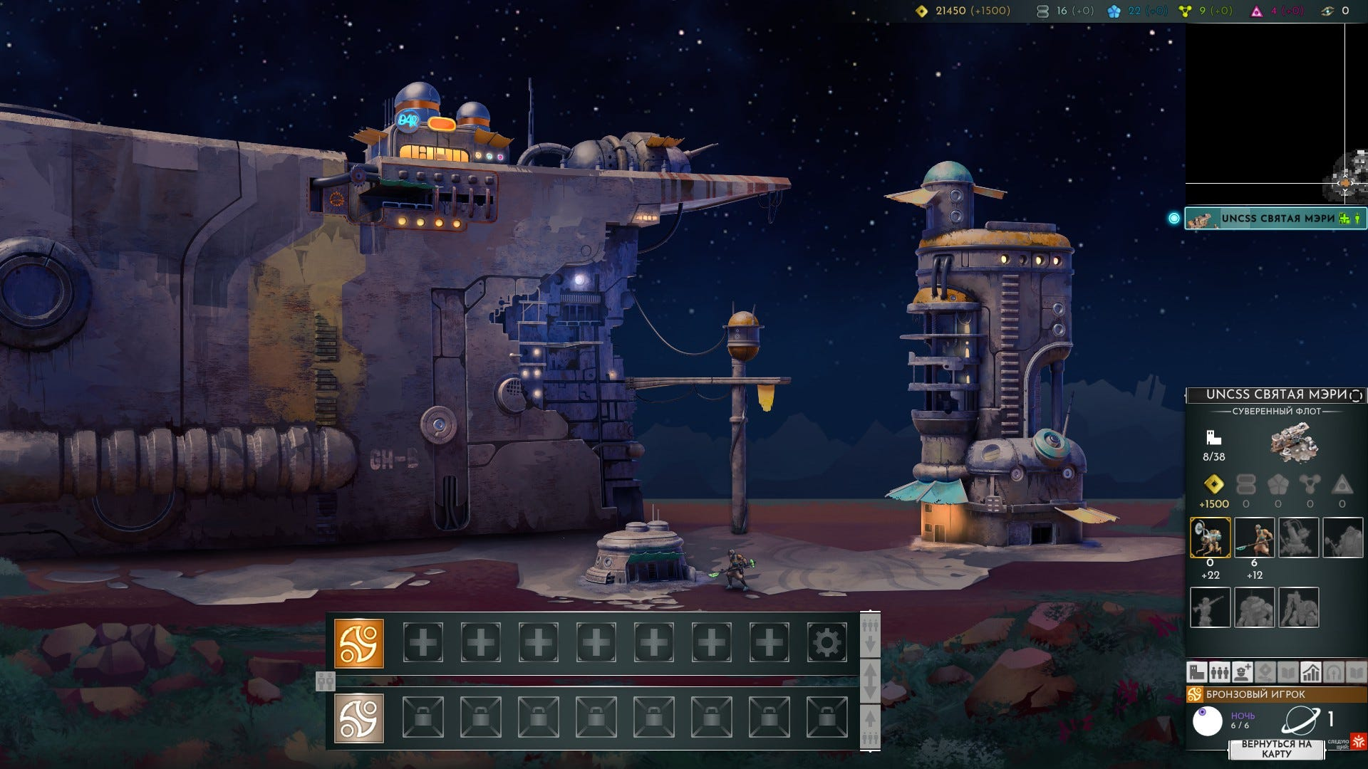 Изумительная изюминка — это старые добрые экраны со зданиями на них, стоящими на холмах, но из-за Sci Fi особенности это абсолютно разный подход — например, мой любимый, банальный, но уютный корабль, приземленный на землю — «город» тех самых техномусорщиков, при постройке новых «зданий» обрастающий новыми отсеками.